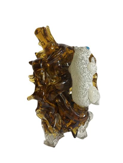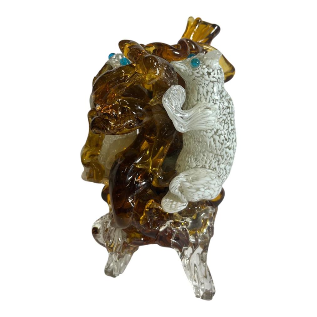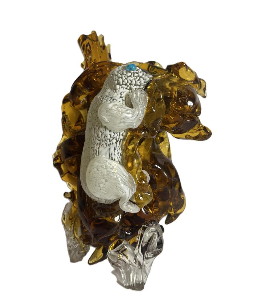 Zajímavá skleněná soška dvou medvědů, kteří se schovávají na stromě. Autorem je Jaroslav Brychta, sklárna Železný Brod. Medvědi mají žíhanou bílou srst a zářivě modré oči. Výška 19 cm, v nejširším bodě 15 cm. Jednomu z medvědů chybí ouško, v jednom místě je sklo uštípnuté, místy pár oťuků.