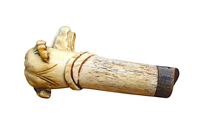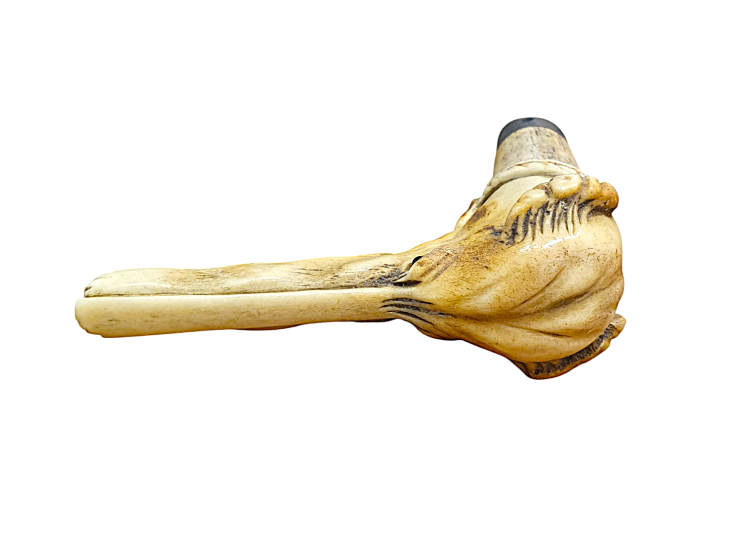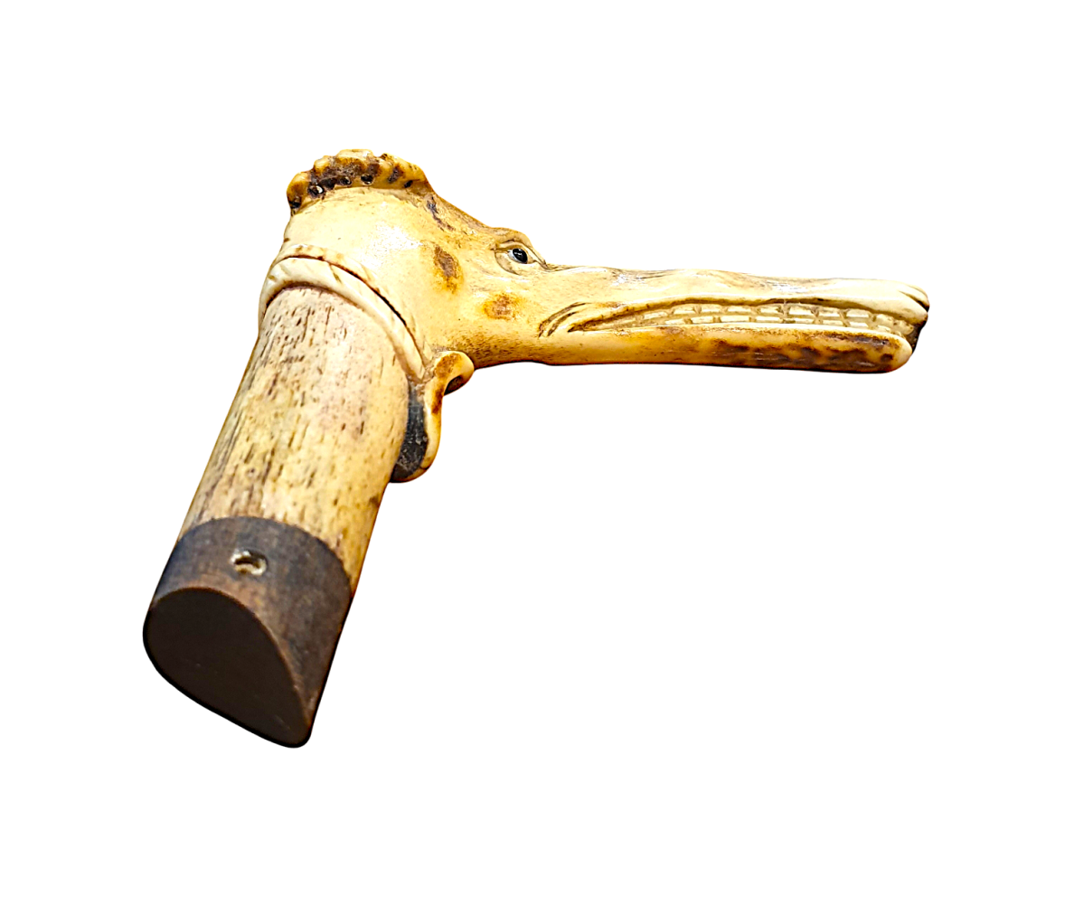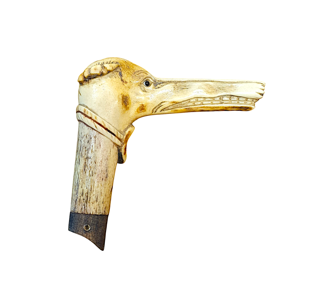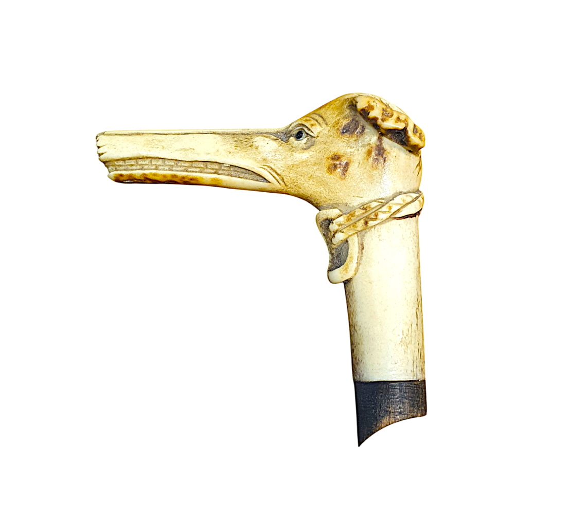 Vršek vycházkové hole ve tvaru hlavy chrta, který má předimenzovaný rozměr čenichu a silně expresivní výraz, působí až groteskně. Rytina rysů je detailní a velmi zdařilá, místy jsou plochy tónované. Materiál - paroh, celková výška 9 cm, délka 9 cm.