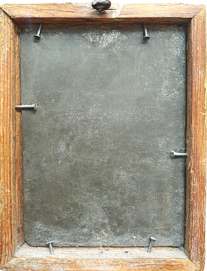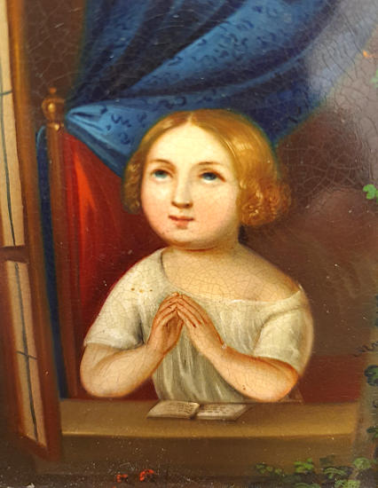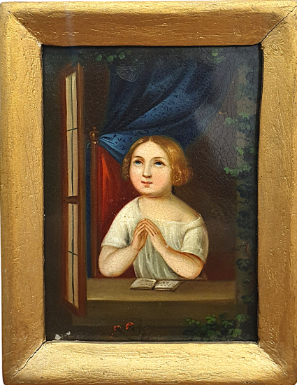 Krásná drobná malba s motivem děvčátka v okně, které se modlí. Malba je tvořena velmi malými, jemnými tahy štetce, příjemná je i rovina formální stránky obrázku, celou malbu vyplňuje okno, které rámují drobná kvítka a porůstá břečťan. V centru stojí dívka a s nadějí v očích upíná zrak do nebe, ruce spjaté k modlitbě. Olej na plechové destičce, rámováno ve zlatém rámu, rozměry s rámem 10 x 8 cm, rozměry malby 7,5 x 5,5 cm. Nesignováno.