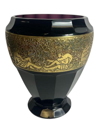 Krásná váza z ametystového skla od značky Moser, kterou zdobí oroplastika. Motivy na oroplastice zobrazují boj. Výška 14 cm, průměr hrdla 10 cm, podstava 7 cm. Značeno vespod - Moser. Váza má velmi drobné oťuky na broušených hrankách a jeden malý oťuk nad pásem oroplastiky. Na podstavě mělké rýhy, viz foto.