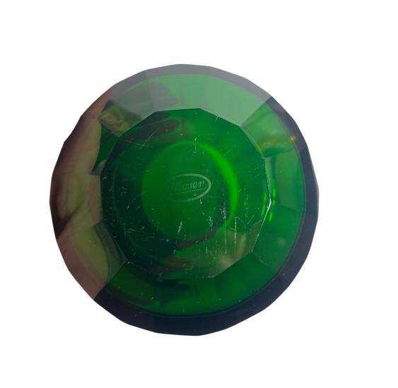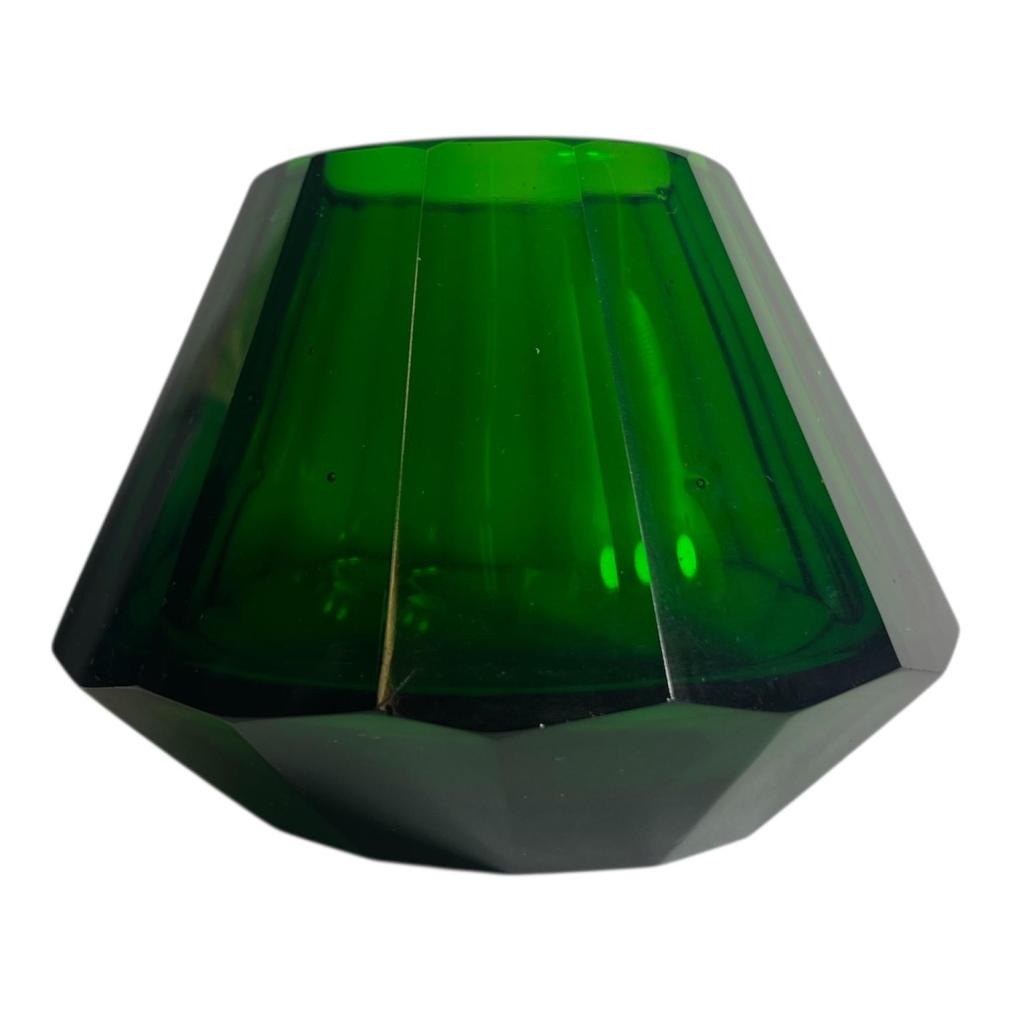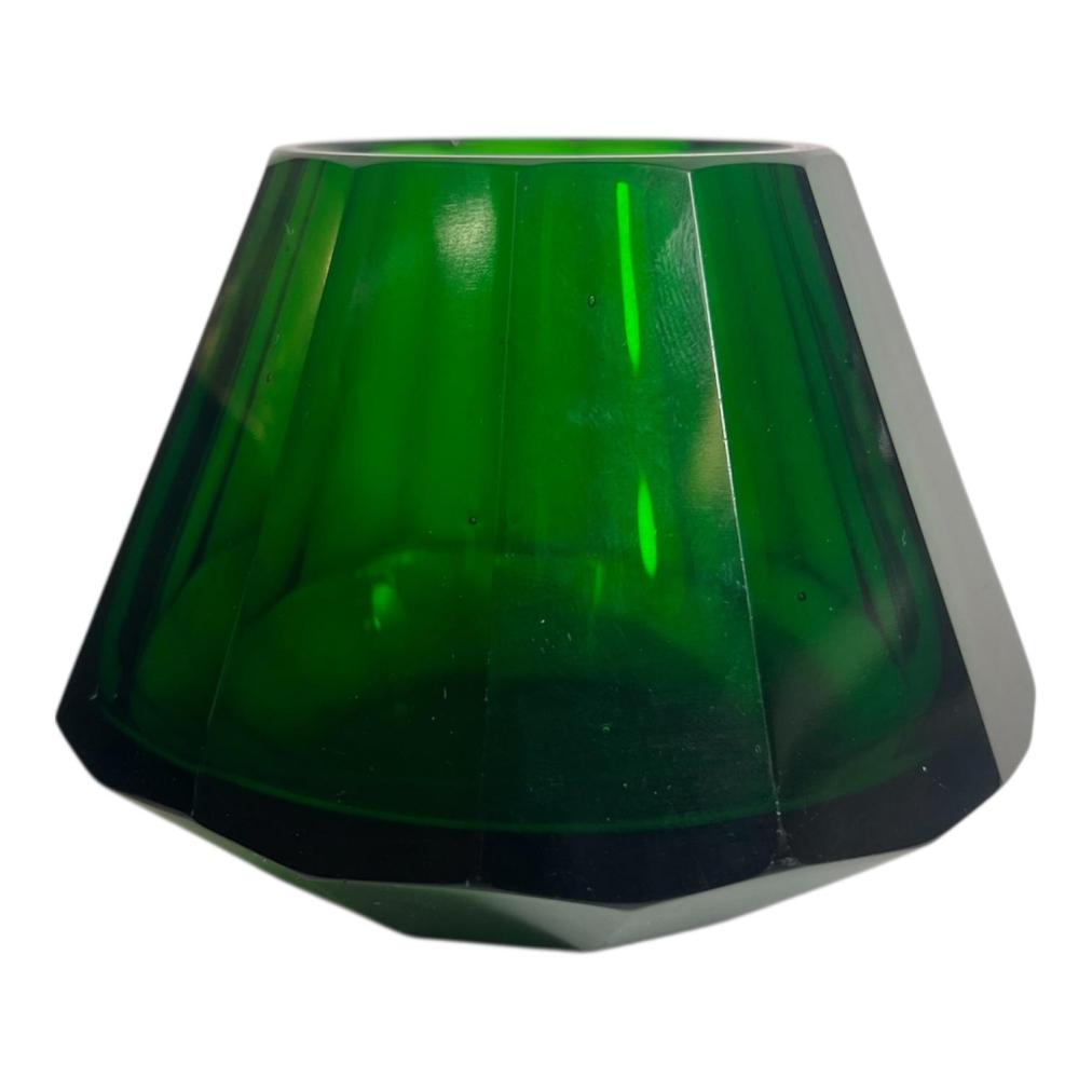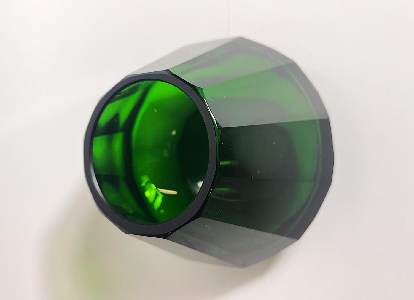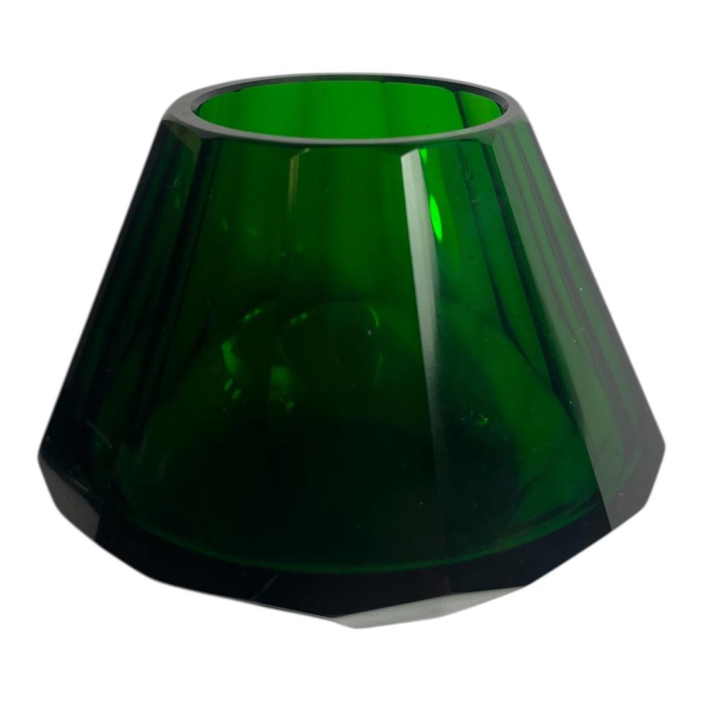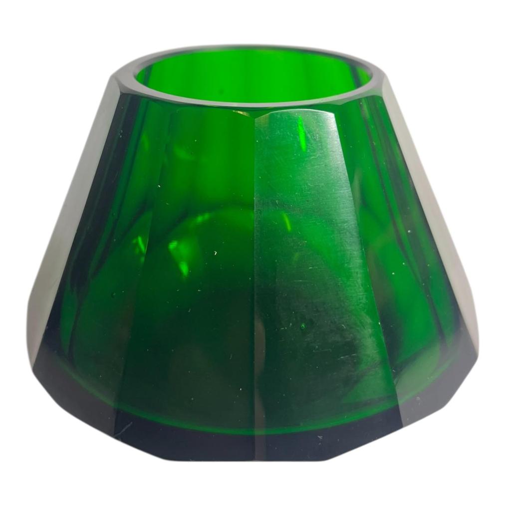 Krásná váza menších rozměrů v tmavě zeleném provedení od značky Moser. Design 12ti-hranné vázičky je naprosto nadčasový. Výška 8 cm, průměr hrdla 6 cm, průměr vázy 11,5 cm, podstava 6 cm. Značeno vespod - Moser. Ve skle jsou místy bublinky, které vznikají přirozeně v procesu výroby, váza již byla místy opravována - zboušena, na dvou místech mělká rýha, stejně tak na podstavě, viz foto.