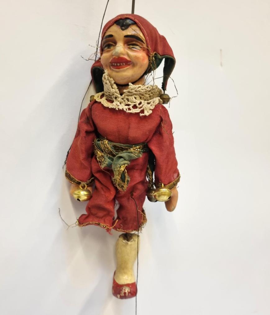 Krásná detailní loutka představující rozesmátého kašpárka s rolničkami. Hlava a končetiny jsou ze sádry, tělo je z kombinace dřeva a drátků. Původní, ručně šité látkové šaty, čapka, krajka a cinkající rolničky dodávají loutce jedinečný charakter. Upevněno na ovládacím mechanismu složeného z drátku, dřeva a šňůrek, šňůrky jsou utržené. Figurka měří na výšku 20 cm, na šířku 8 cm. Hloubka v nejširší části je 5,5 cm. Loutce chybí jedna noha, má poškozenou levou ruku a oťuk na nose, oprýskanou barvu na botě a dřívko které uchycuje drátek s nohou je naštíplé. Oblečení je potřeba na pár místech opravit. Značeno na přední straně ovládacího mechanismu- nálepka Munzbergovy loutky.