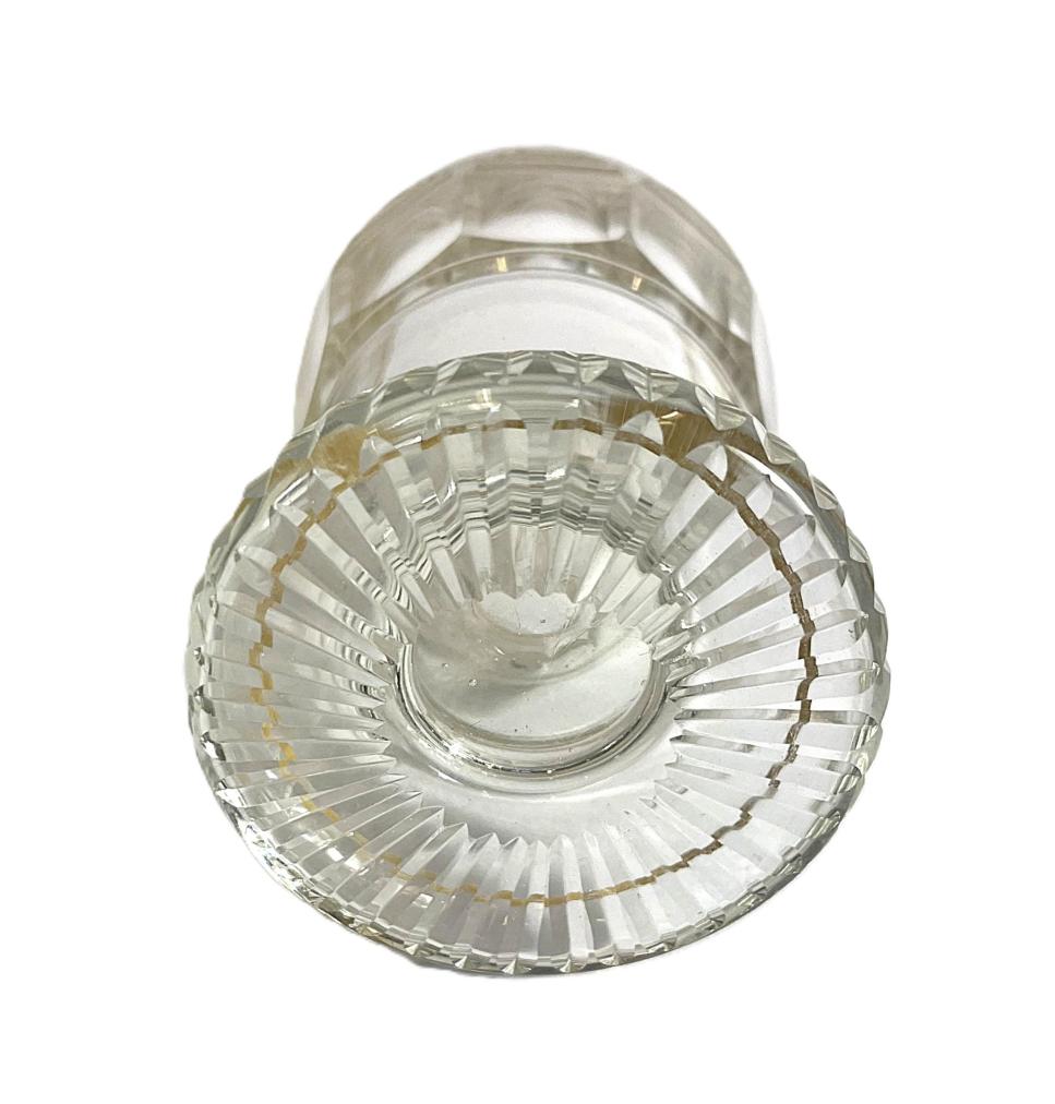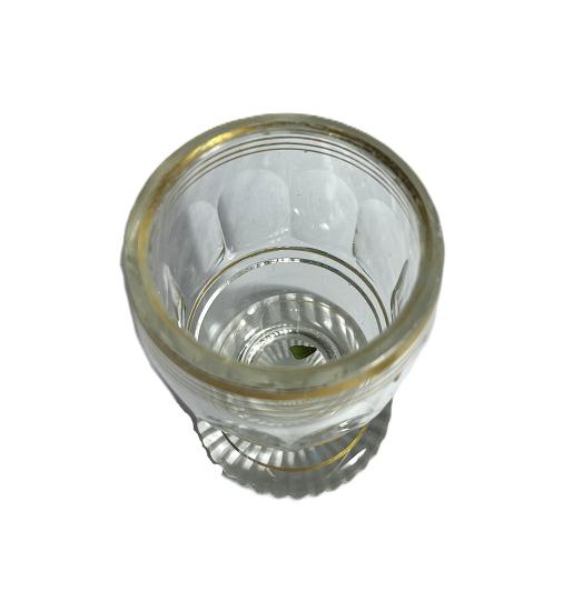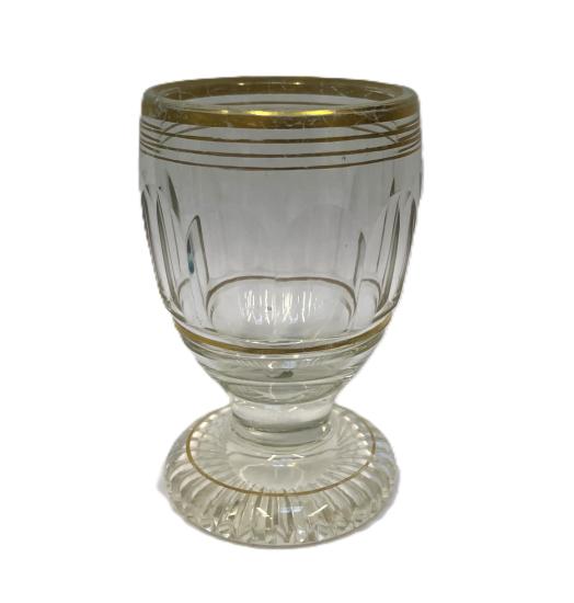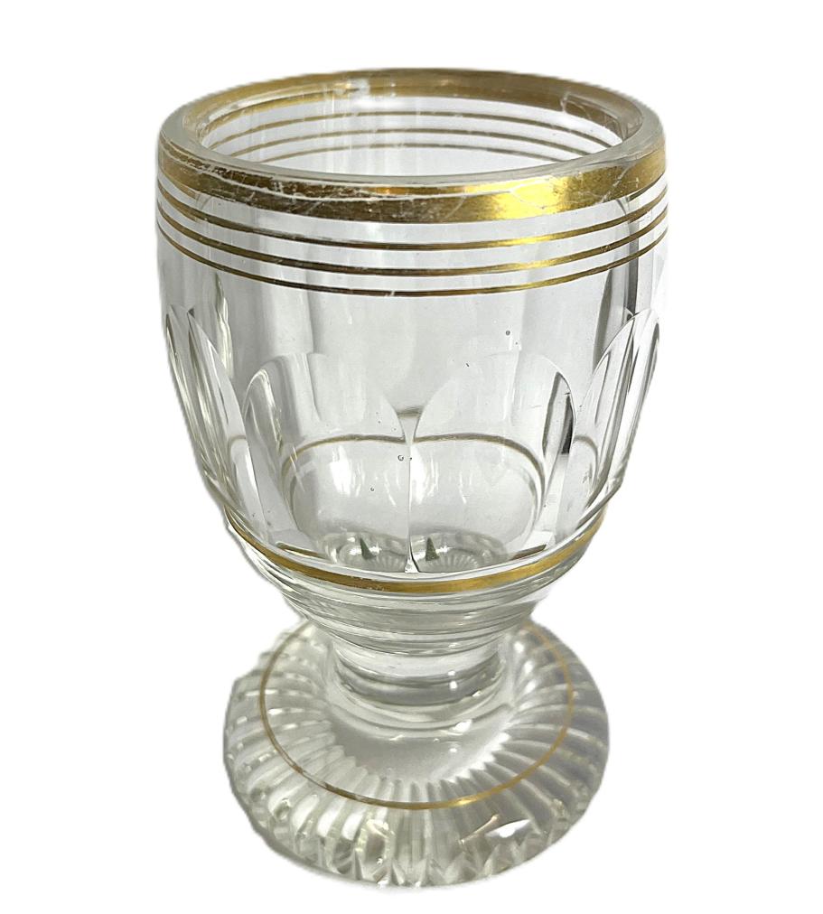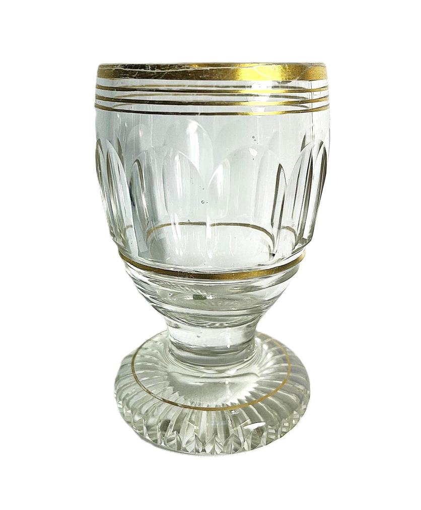 Krásný pohárek s broušenými ploškami a podstavou. Okraje a podstavu lemují zlaté pruhy, místy setřené. Výška 12 cm, průměr 7 cm, průměr podstavy 7 cm. Na hraně je jeden lehký oťuk. Neznačeno.
