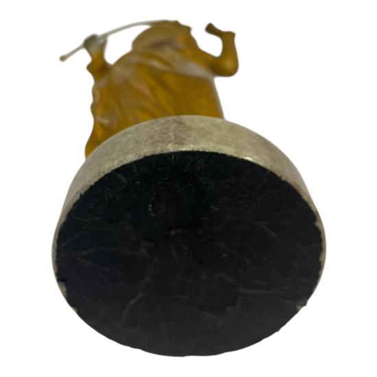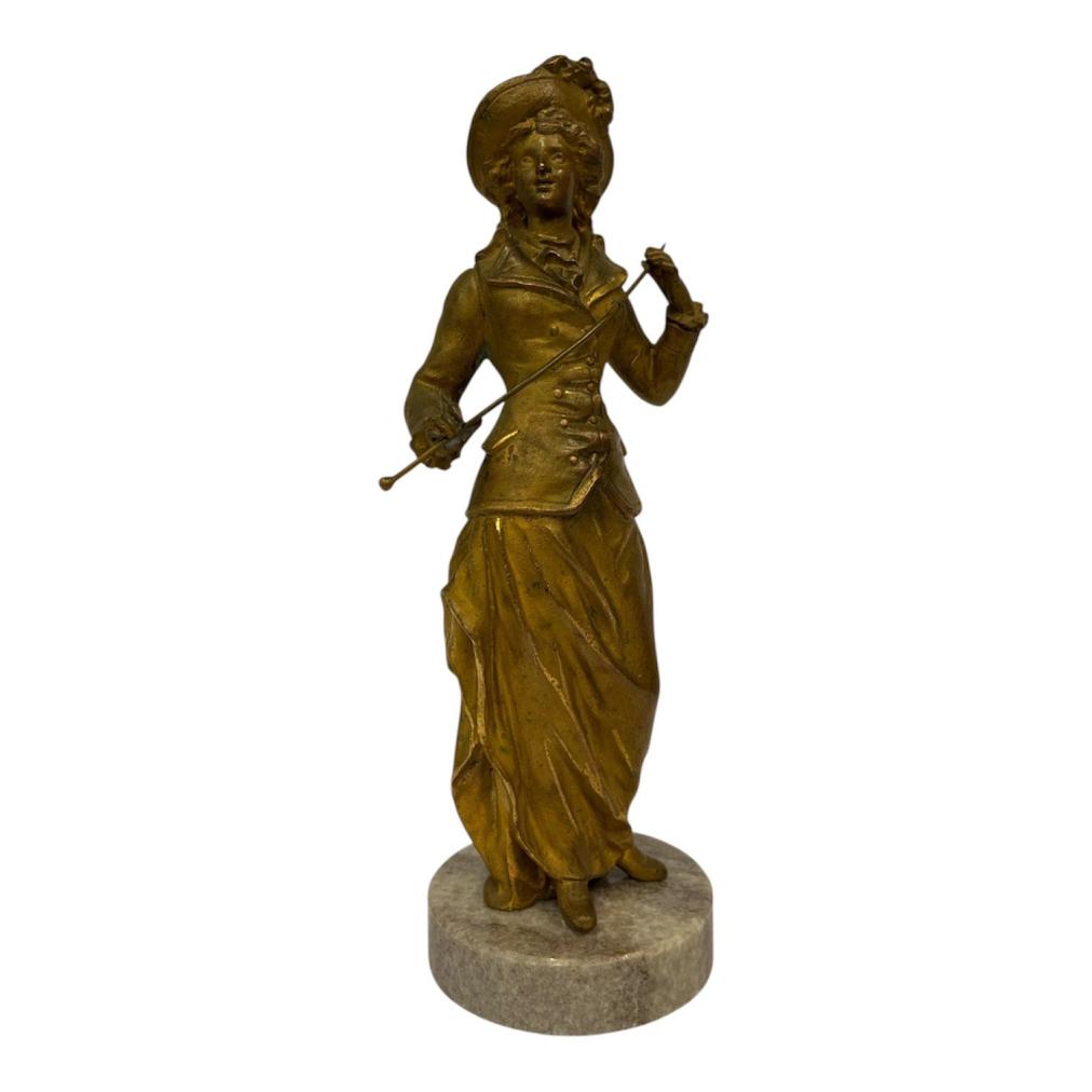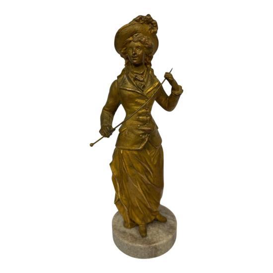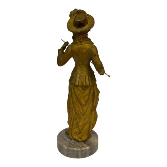 Soška ženy v dobovém oblečení, honosným kloboukem a proutkem v ruce. Francie, 19. století. Materiál slitina, patina bronz, výška včetně podstavce 25 cm, v nejširším bodě 9 cm, podstavec 8 cm. Soška je na mramorovém podstavci.