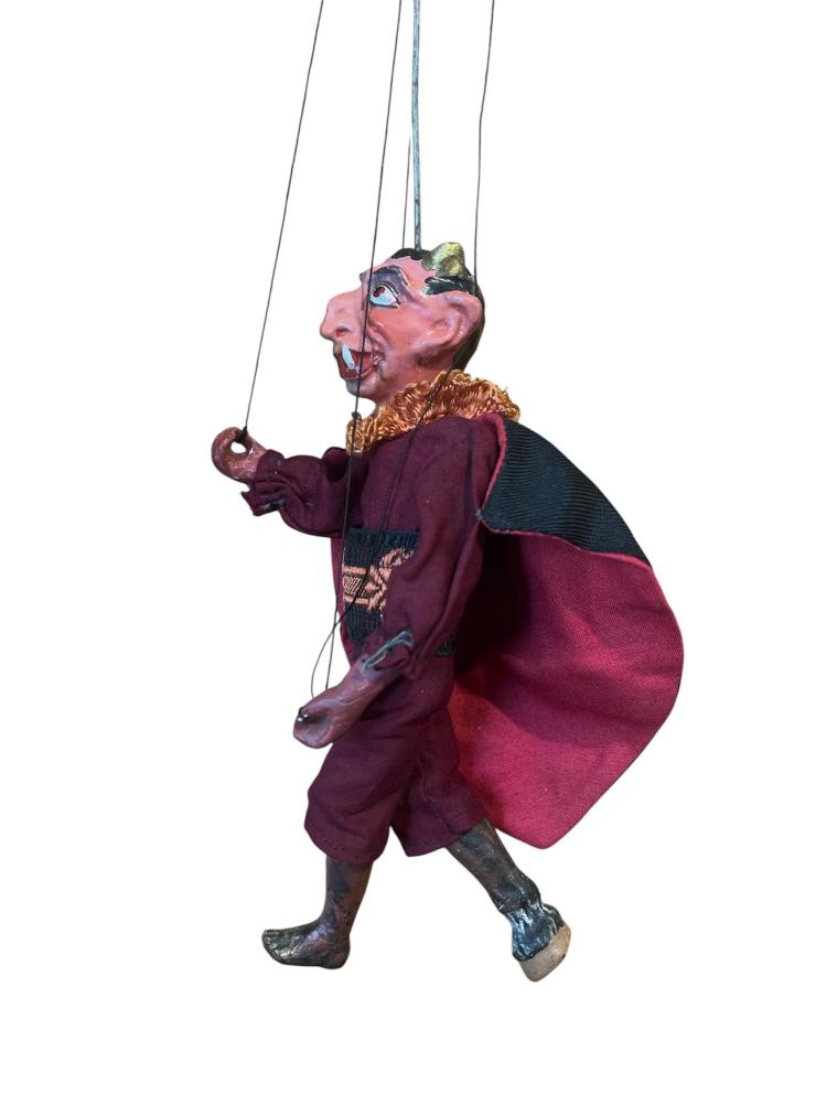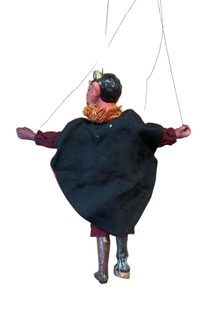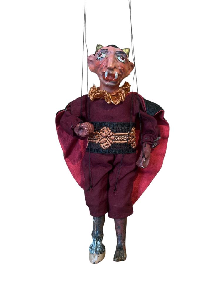 Unikátní starožitná loutka představující čerta ve správném čertovském oděvu. Čert má děsivé rysy, rohy a vykulené červené oči. Dalším výrazným detailem je bosá noha a jedno kopyto. Hlava a končetiny jsou z malované sádry, tělo je z kombinace dřeva a drátků. Původní, ručně šité látkové oblečení a plášť dodávají loutce jedinečný charakter. Upevněno na ovládacím mechanismu složeného z drátku, dřeva a šňůrek, ovládání je funkční, pouze hlavní drát je trochu ohnutý. Figurka měří na výšku 19 cm, na šířku 7 cm. Hloubka v nejširší části je 4 cm. Postava má jedno malé poškození v glazuře ve spodní části levého parohu. Plášť je na vnitřní červené podšívce roztržen (ze přední strany nejde vidět). Neznačeno.