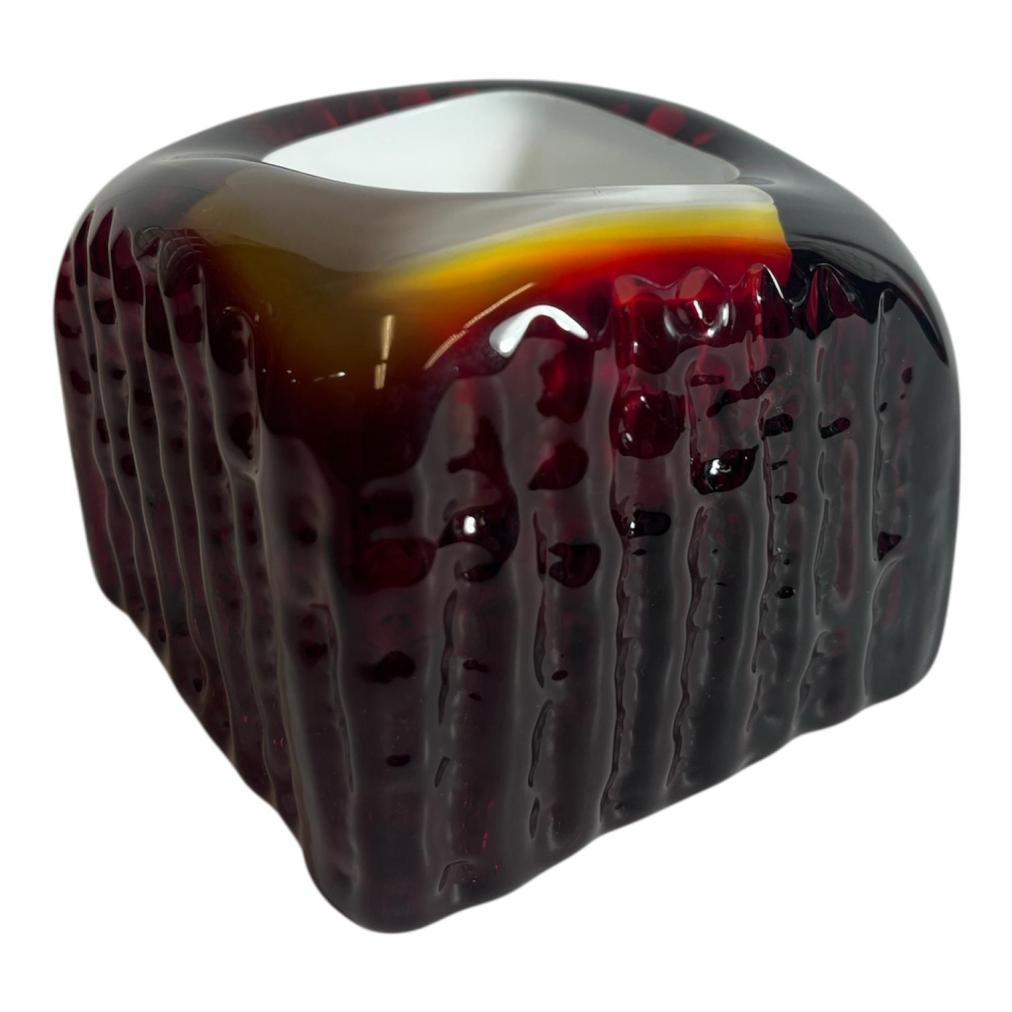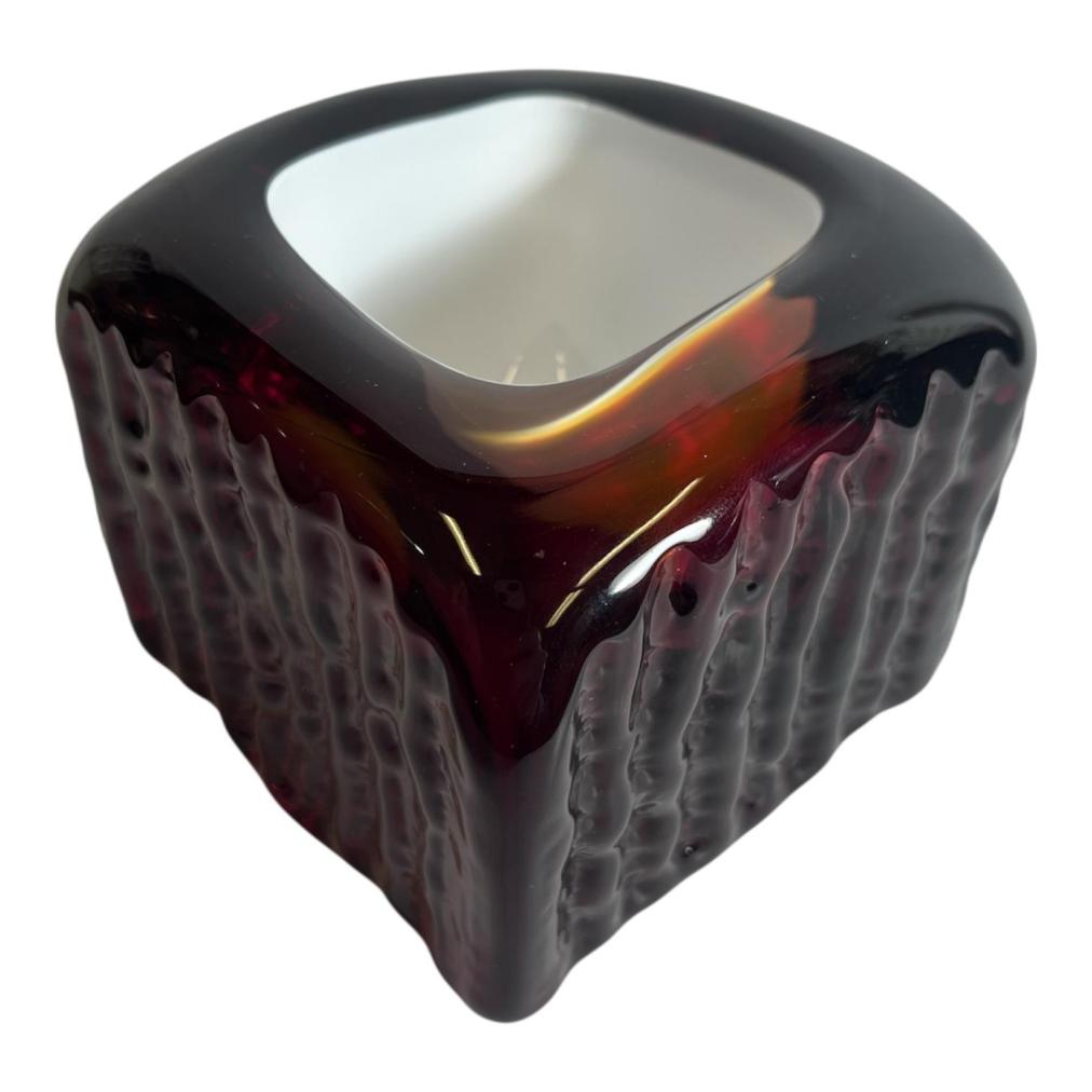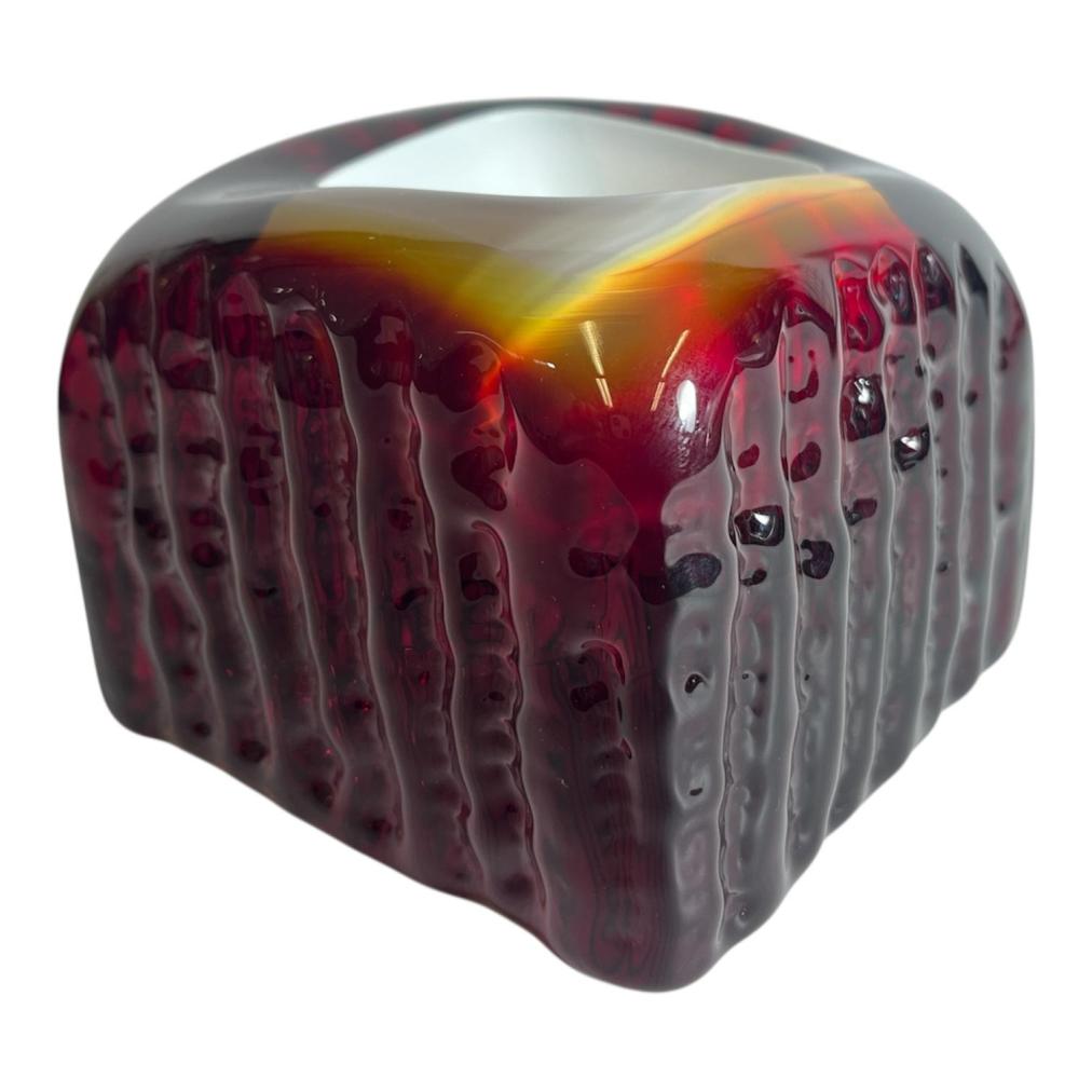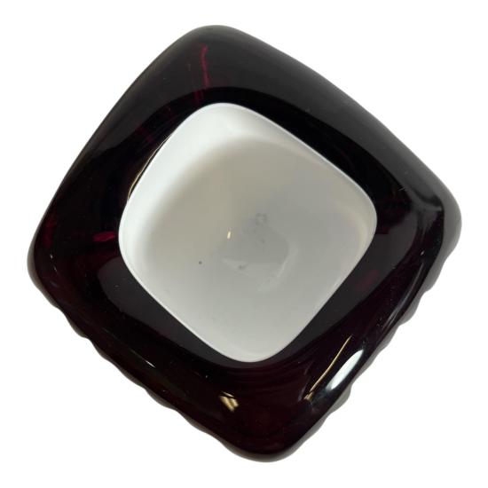 Zajímavý, masivní skleněný objekt, který má uvnitř prostor na různé předměty. Díky netransparentní bílé barvě uvnitř nádoby vzniká kolem středu zajímavý gradient. Výška 8,5 cm, podstava 10 x 10 cm. Neznačeno, podstava má několik rýh - viz foto, jinak bez poškození.