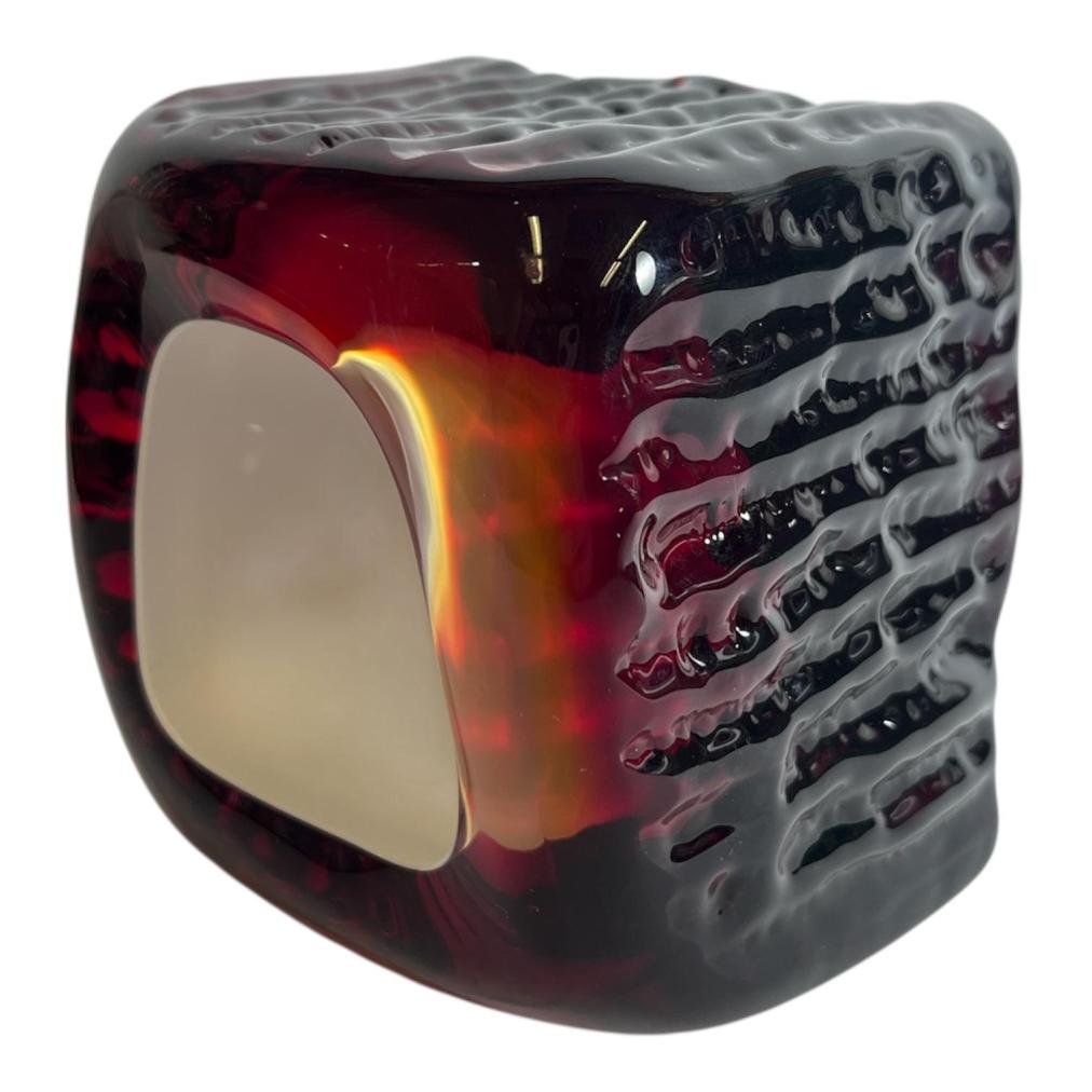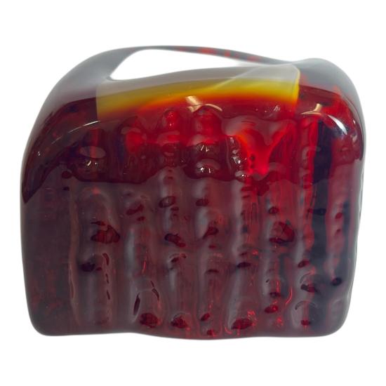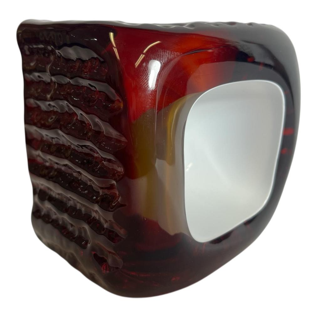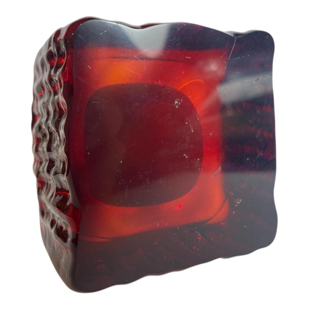 Zajímavý, masivní skleněný objekt, který má uvnitř prostor na různé předměty. Díky netransparentní bílé barvě uvnitř nádoby vzniká kolem středu zajímavý gradient. Výška 8,5 cm, podstava 10 x 10 cm. Neznačeno, podstava má několik rýh - viz foto, jinak bez poškození.