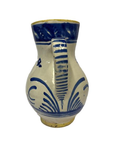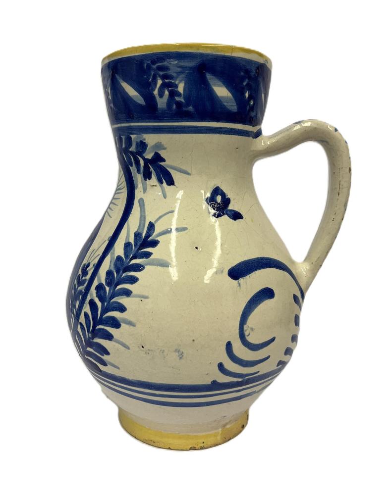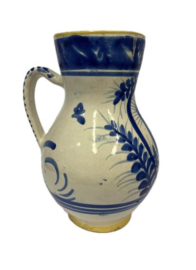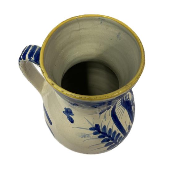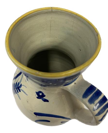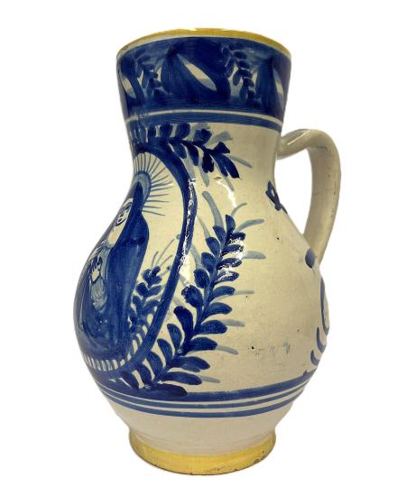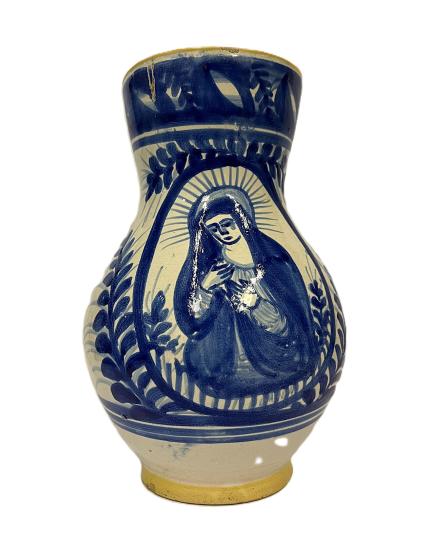 Krásný starožitný keramický džbán z 19. století s vyobrazením madony. Ikonu rámují klasy obilí a linka kolem, modré linky a zdobení najdeme po celém džbánu, okraje lemuje žlutá barva. Výška 23 cm, průměr hrdla 10,5 cm, podstava 8,5 cm. Na podstavě je několik větších oťuků, na hraně hrdla také viz foto, ucho džbánu také menší oťuky, z vnější strany džbánu jedna výrazná prasklina.