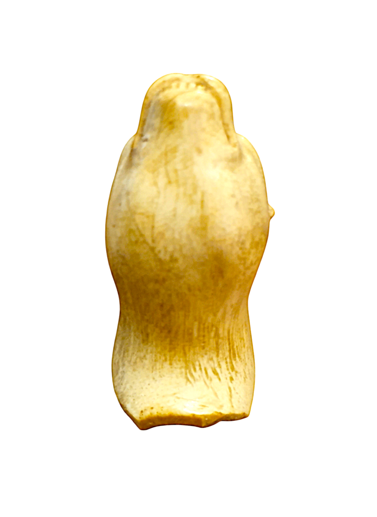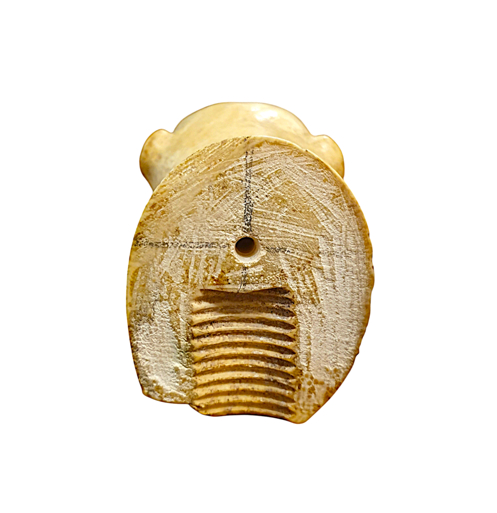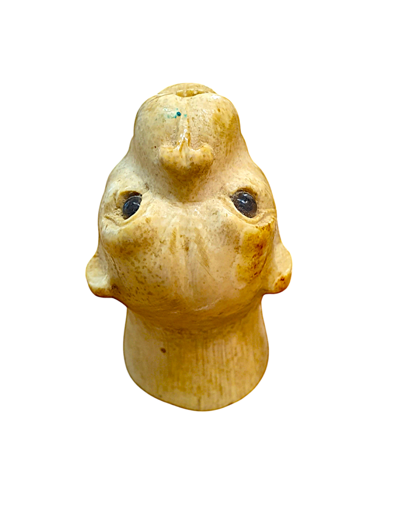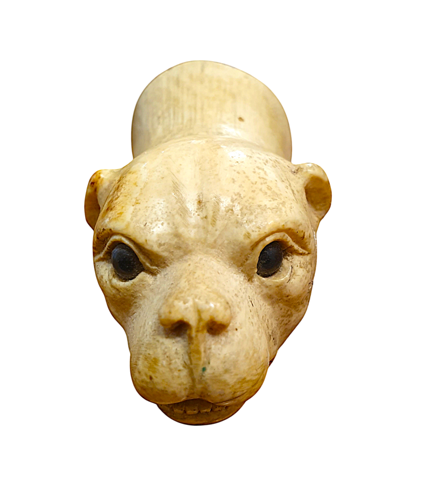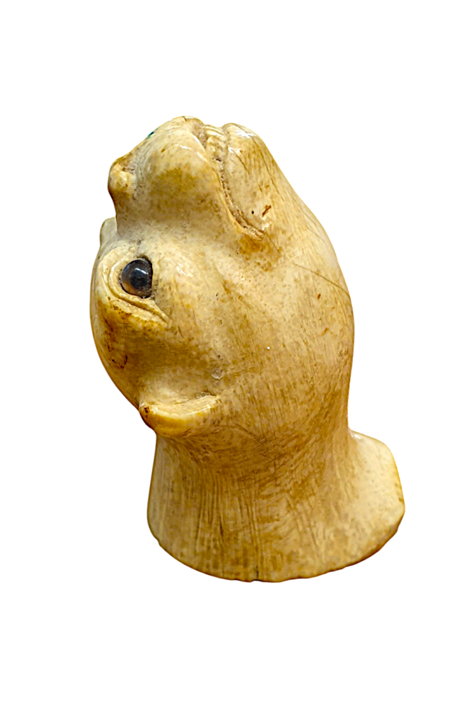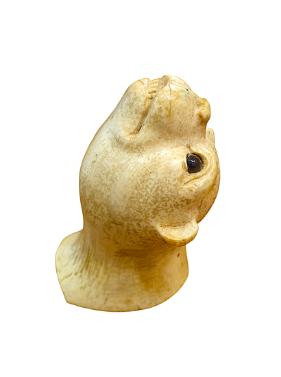 Zvířecí hlava z mrožoviny. Zvíře má jemně tesané rysy, drobné zuby, materiál se svým charakterem a jemným žíháním snoubí s námětem zvířete. Délka 6,5 cm, v nejširším bodě 3,8 cm.