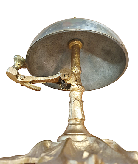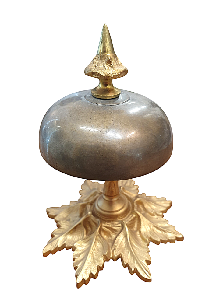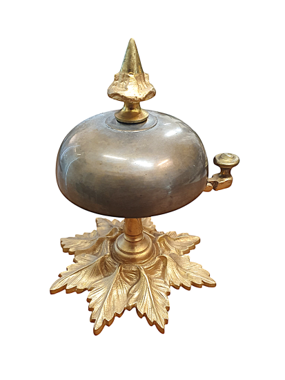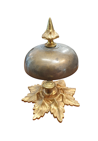 Krásný kovový zvonek na nožičce se zlaceným dekorem ve formě listů. Výška 12 cm, průměr podstavy 9 cm, průměr zvonku 7 cm. Velice hlasitý a mohutný tón.