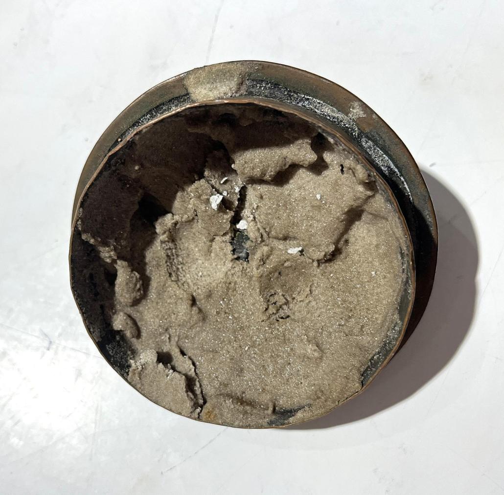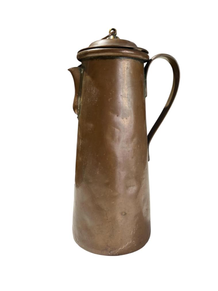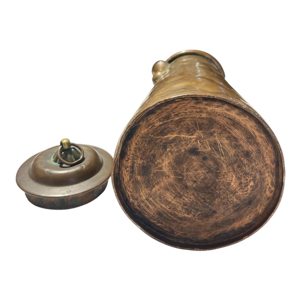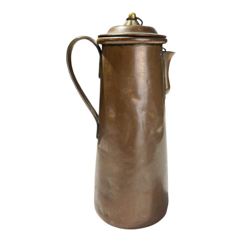Stará mosazná konvice s deklíkem. Celková výška i s očkem na uzávěru je 32 cm. Vnitřní průměr hrdla je 8 cm. 13 cm. Průměr podstavy je 12,5 cm. V nejširším bodě i s uchem měří 16 cm .Konvice je na několika místech promáčknutá nebo lehce deformovaná, víčko je vyplněno těžkým materiálem. Stav odpovídá stáří, neznačeno.