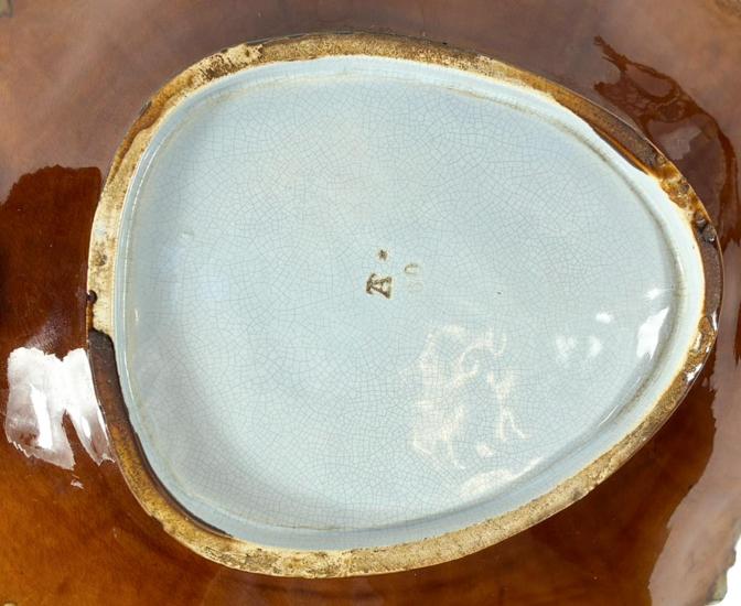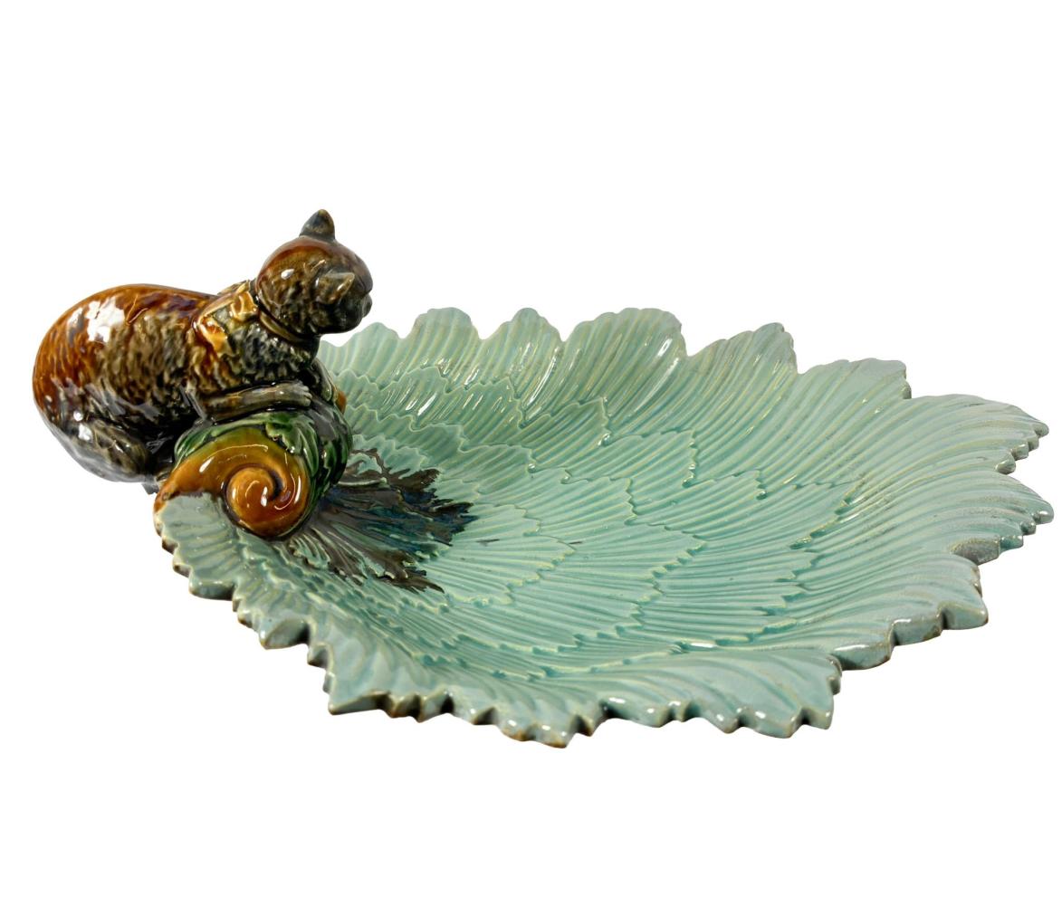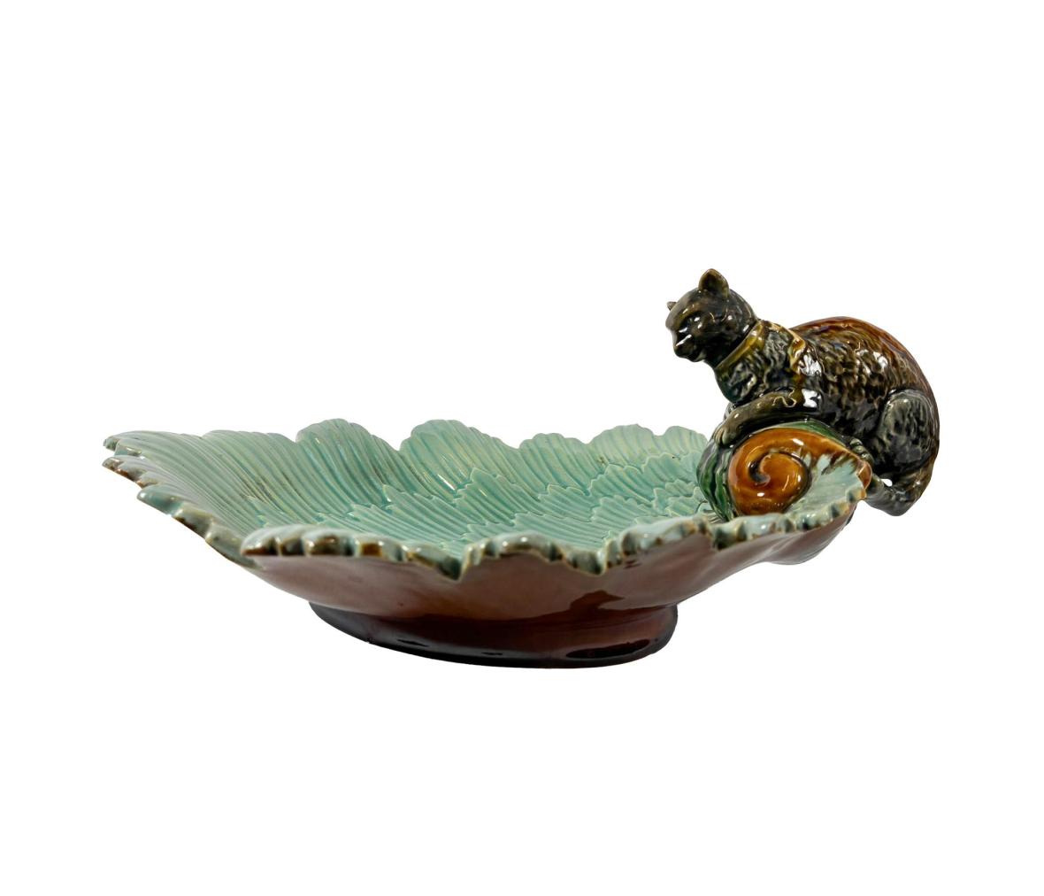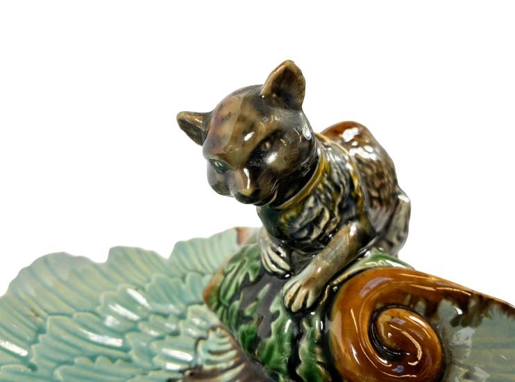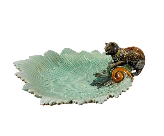 Porcelánová mísa s kočkou na okraji. Mísa je složená z florálních obrysů v tyrkysovém odstínu, kočka se krčí na okraji mísy a kouká dovnitř. Glazura je bez poškození a má velmi lesklý povrch. Výška 12 cm, rozměr mísy 30 x 22 cm. Na míse je jeden oťuk.