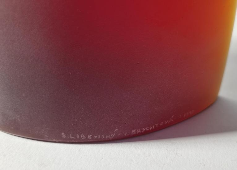 Skleněná plastika od páru Libenský & Brychtová o rozměrech 36,5 x 28 x 8 cm. Signováno, datováno viz foto. Sklárna Železný Brod, pravděpodobně se jedná o pozdější odlitek do originální formy autorů.