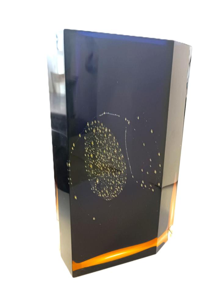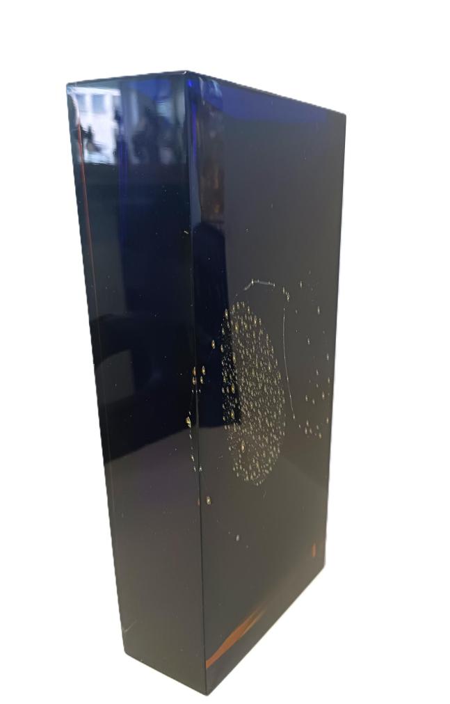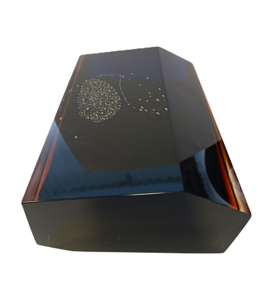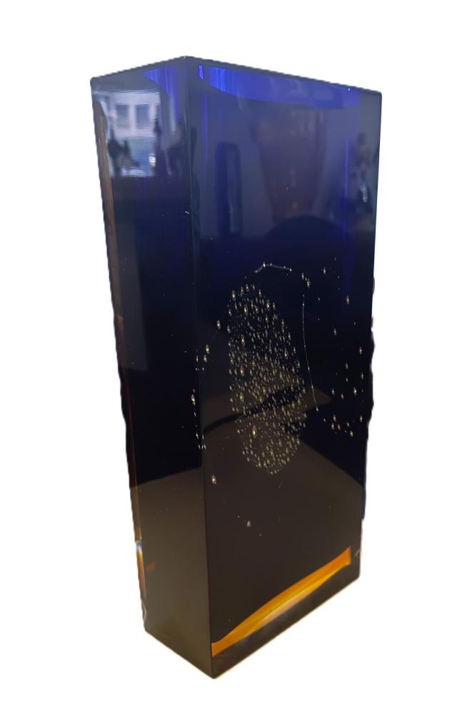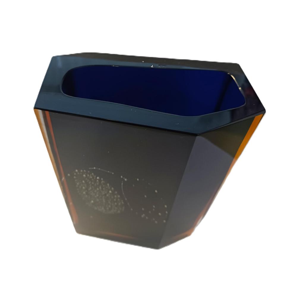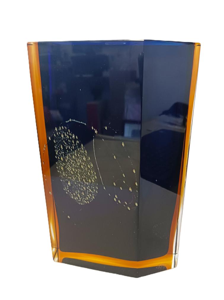Krásná skleněná váza se zatavenou stříbrnou fólií podle návrhu Pavla Hlavy. Rozmery: 21,5 x 14 x 4,5 cm. Váza je ve skvělém stavu, nepoškozená.