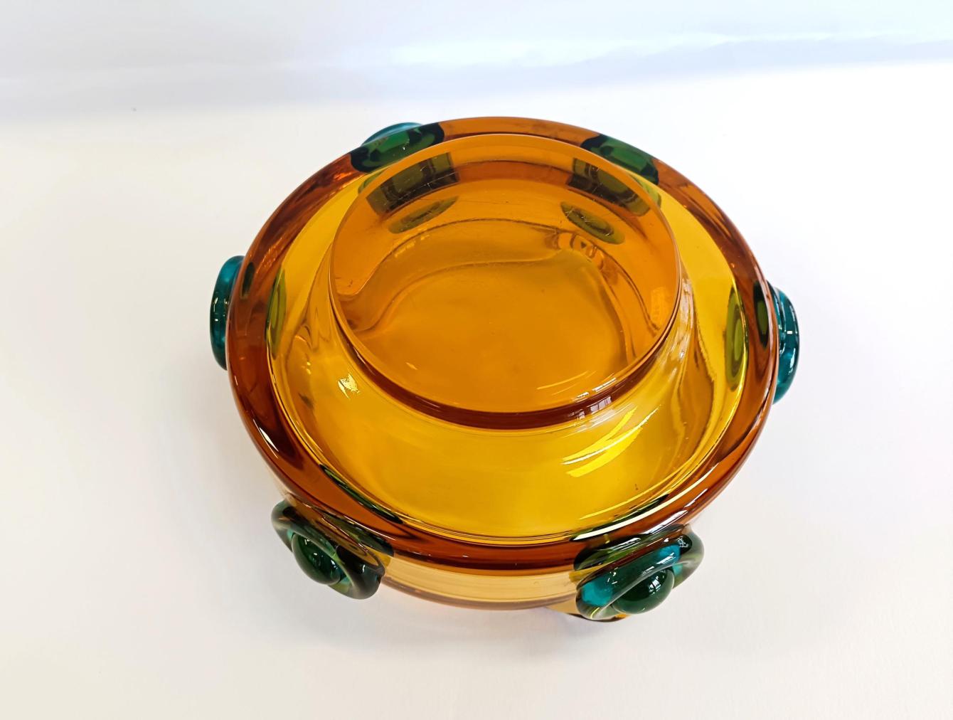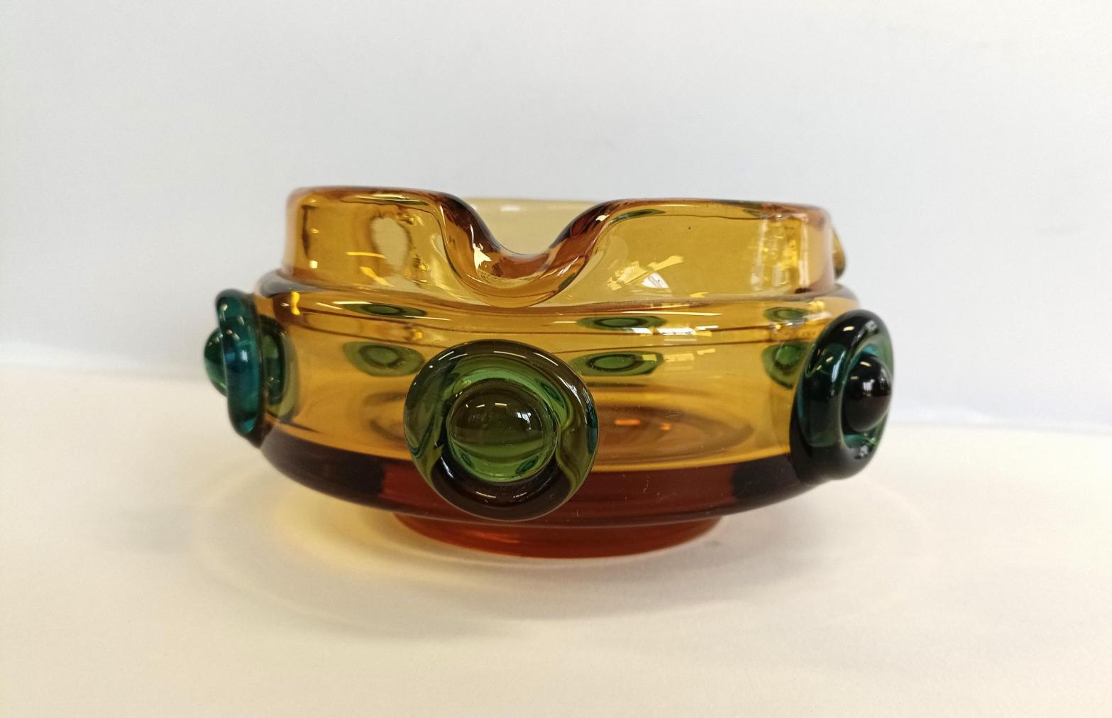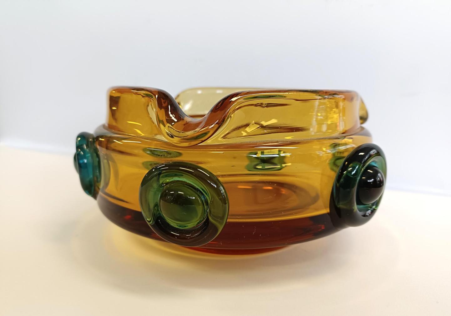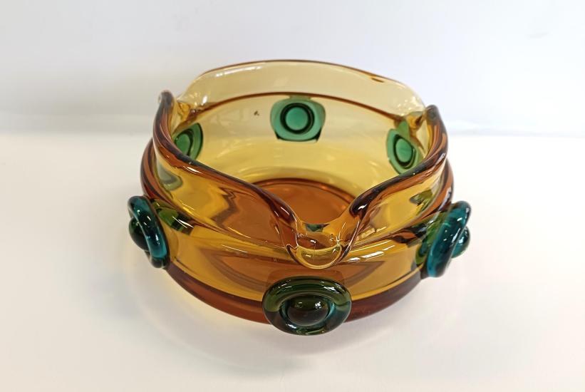 Miska s nálepy z hutního skla. Podle návrhu Josefa Hospodka, sklárna Chřibská. Miska je oranžová se zelenými nálepy. Vysoká 8,5cm, šířka 14cm na podstavci 9cm. Kromě škrábanců na podstavci je miska v perfektním stavu.