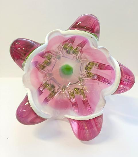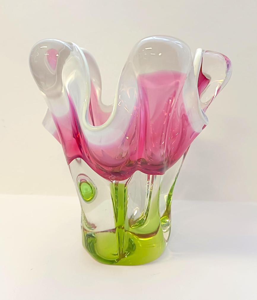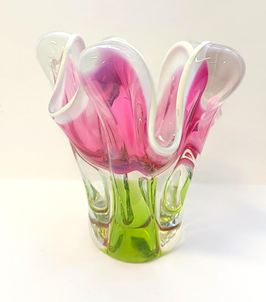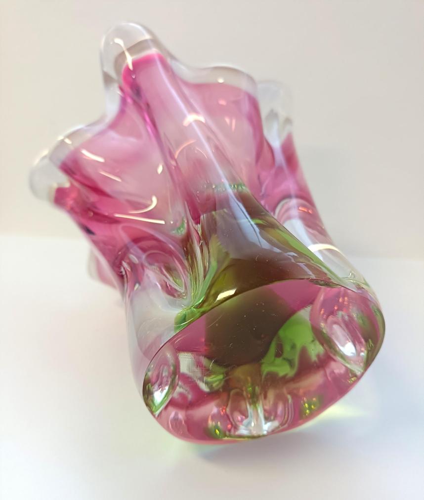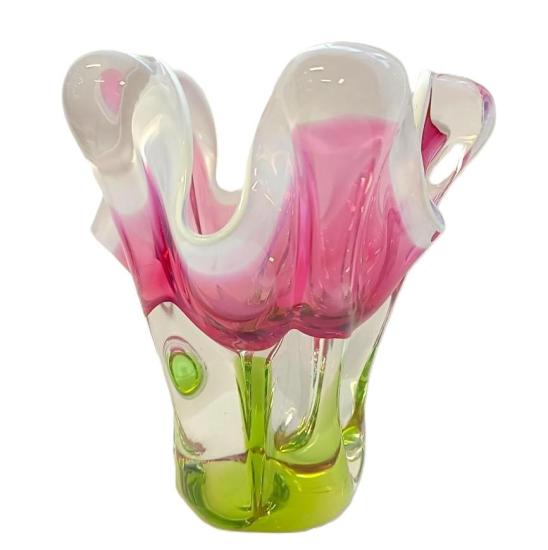 Krásná váza z hutního skla. Autorské dílo ,,Květ,, od autora Josefa Hospodky. Rozměry: 16 x 14 cm na podstavě o průměru 7,5 cm. Váza má na několika místech maličké oťuky.