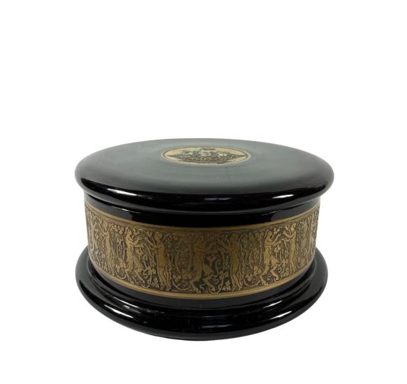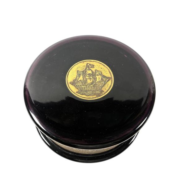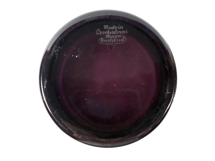 Kulatá dóza z ametystového skla zdobená oroplastikou na víku a podél nádoby. Oroplastika ve vrchní části má podobu plachetice. Výška včetně víka 6,5 cm, výška bez víka 5,5 cm, průměr víka 13 cm, průměr podstavy 13,5 cm. Značeno "Made in Czechoslovak Moser Karlsbad". Na víku je pár mělkých rýh, vnitřní hrana nádoby má také pár oťuků, podstava má mělké škrábance, jiank krásný stav.