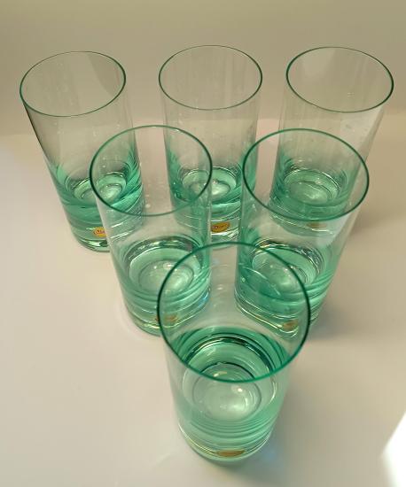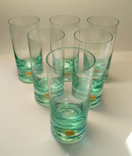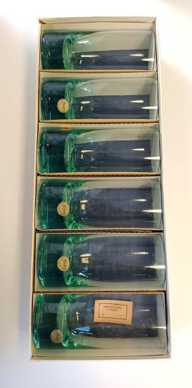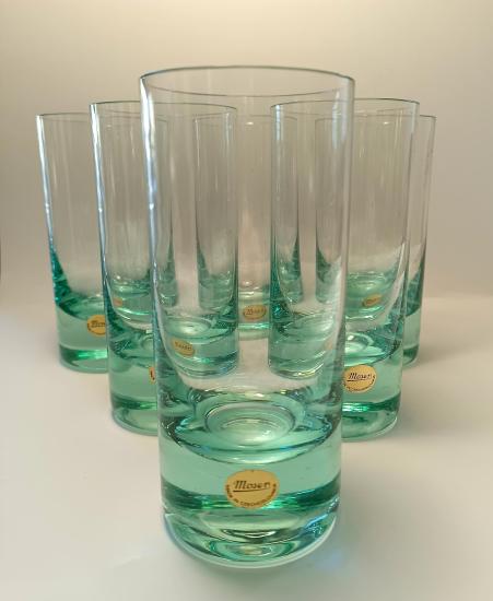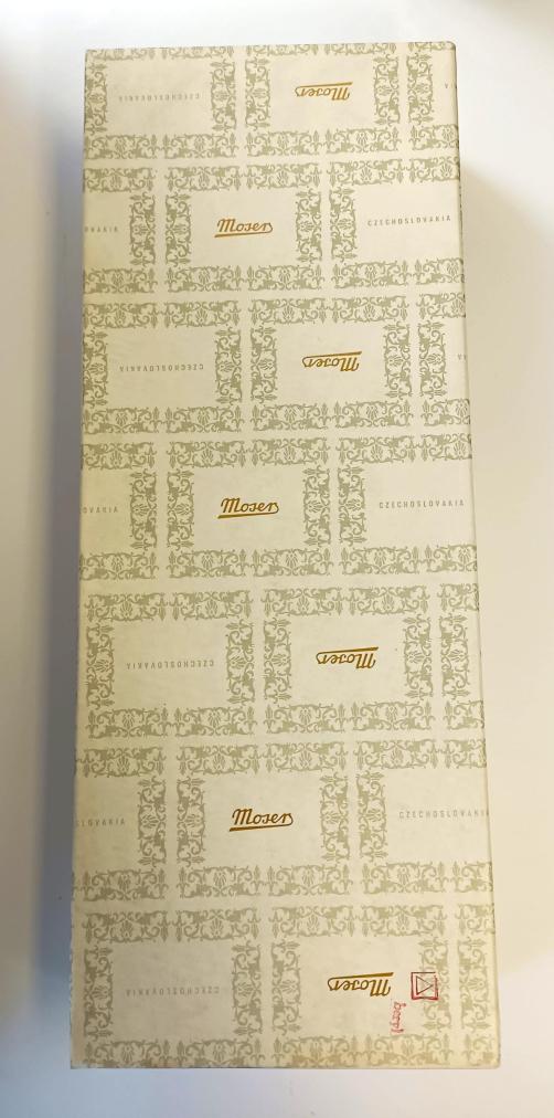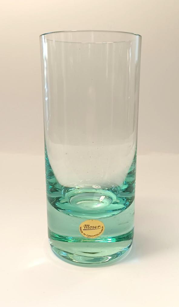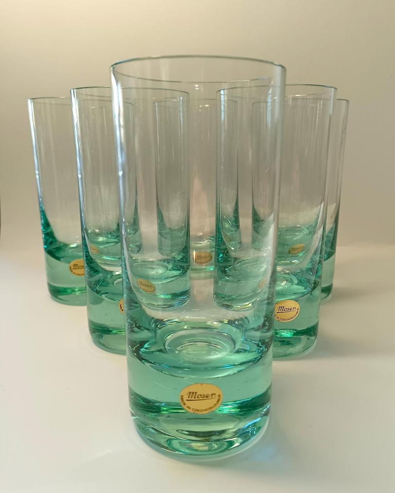 Krásná sada šesti skleniček od značky Moser z křišťálového skla v zelené barvě. Sklenice mají původní samolepku ,,Moser - Made in Czechoslovakia" a jsou uloženy v původní etui. Vše je v perfektním stavu, nepoškozeno. Rozměry: 15,5 x 6,5 cm.