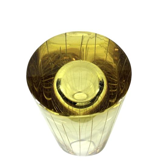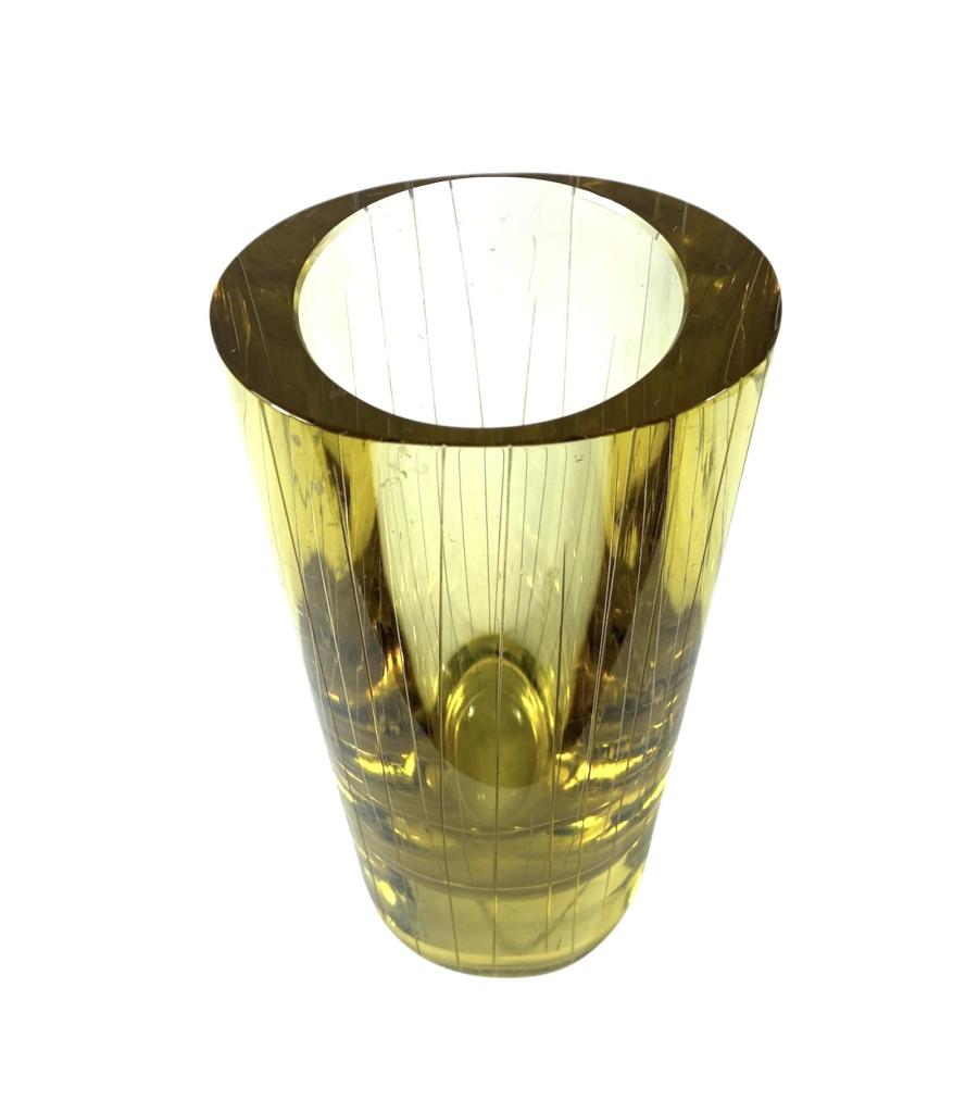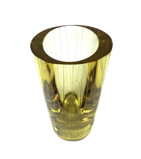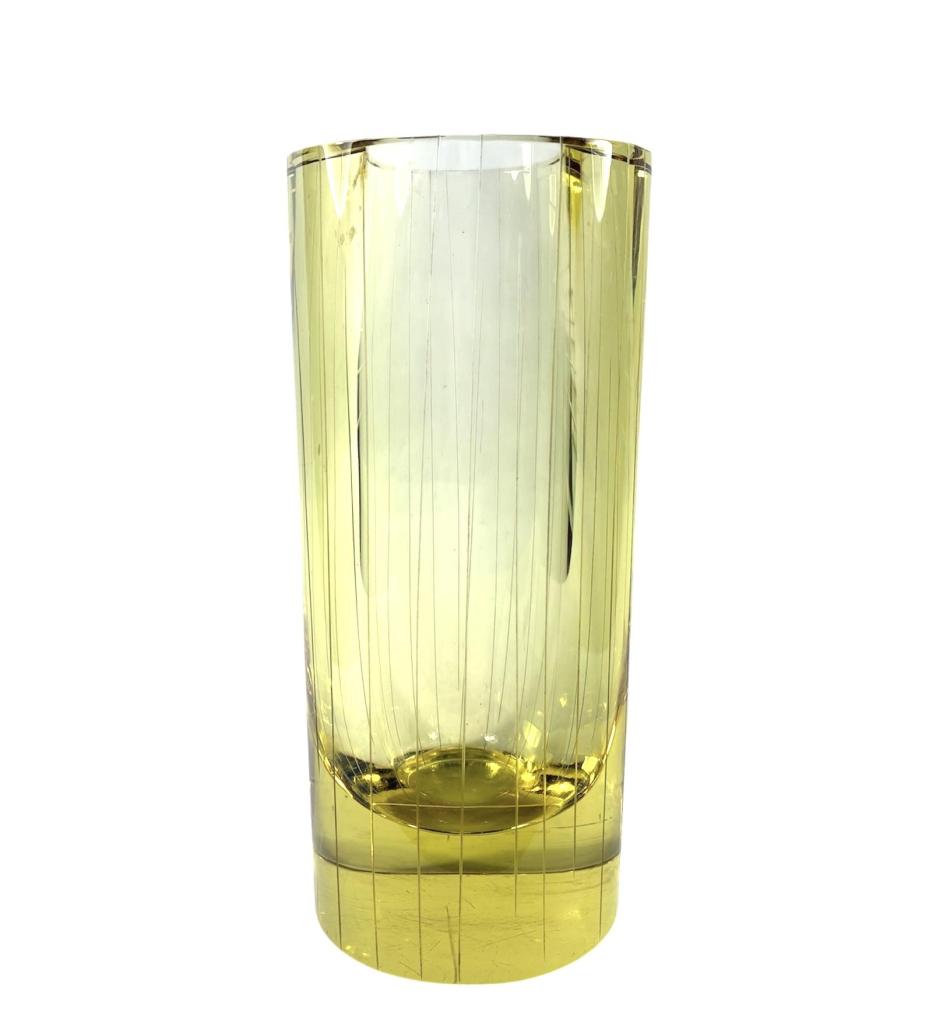 Masivní váza ve žlutém odstínu od značky Moser. Po obvodu má váza broušené detaily ve formě tenkých linií. Výška 23 cm, rozměr vrchní části 8 x 10,5 cm, průměr podstavy 10 cm. Značeno vespod "Moser". Váza má tu a tam mělce poškrábaná místa, jinak pěkný stav.