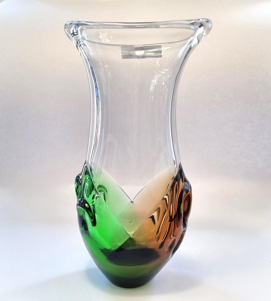 Váza z čirého hutního skla, zdobenaá tvarovanými hnědými a zelenými vrstvami po stranách. Tuto vázu navrhl autor Ladislav Paleček pro sklárnu Škrdlovice. Rozměry: 28 x 13cm, průměr hrdla: 14 x 9,5cm, na podstavci o průměru 5,5cm. Váza je lehce poškrábaná, jinak bez vady.