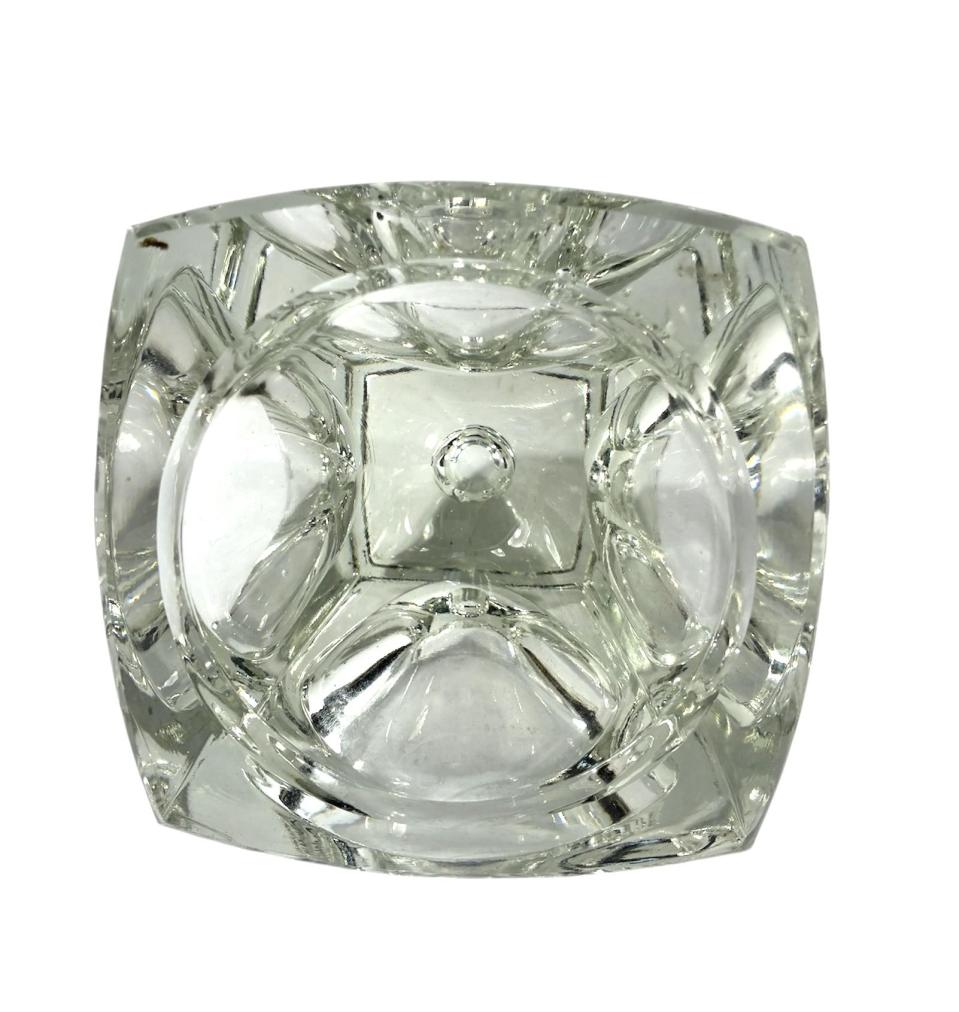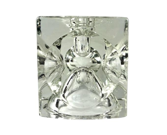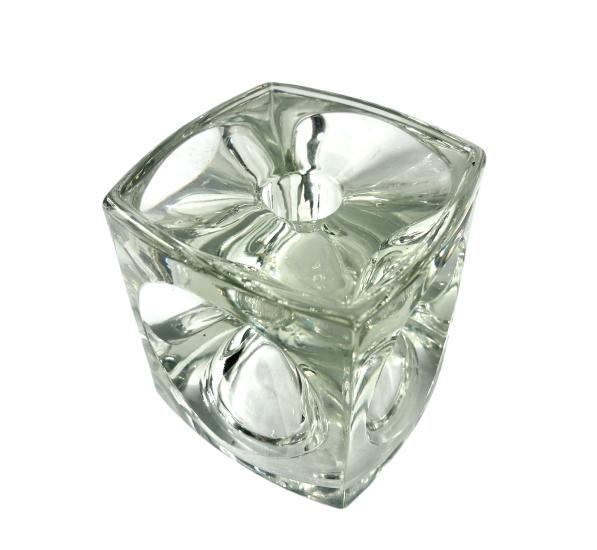 Originální skleněný svícen ve tvaru kostky s kulatými plochami. Výška 9 cm, rozměr stran 9 x 9 cm, menší otvor průměr 2 cm, větší spodní otvor průměr 7 cm. Jedna z hran má mělkou rýhu, jinak skvělý stav. Neznačeno.
