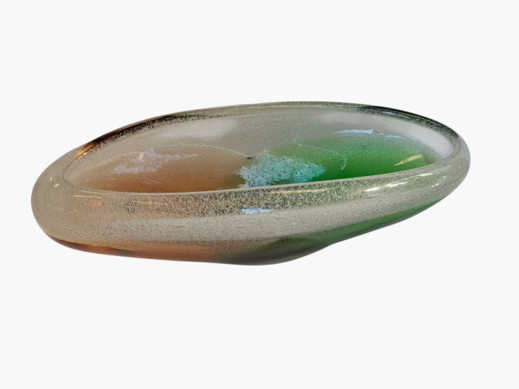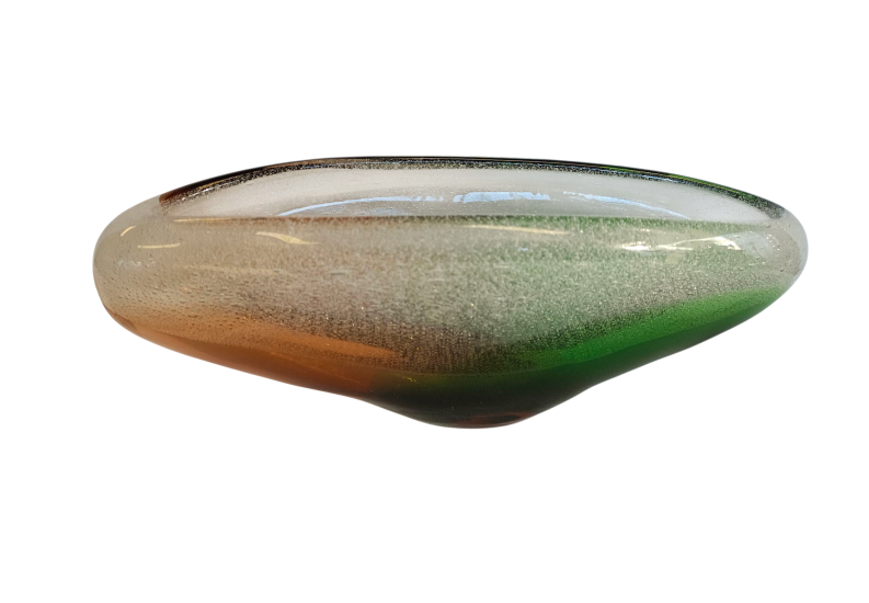 Žardiniéra z hutního skla v modro-zelené kombinaci s vnitřními bublinkami. Autorem je František Špinar, sklárna Škrdlovice. Na výšku měří 9,5 cm, na šířku 26 cm, hloubka je 10 cm. Postava měří 7,5 x 4 cm. Bez signatury, neznačeno. Perfektní stav.
