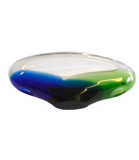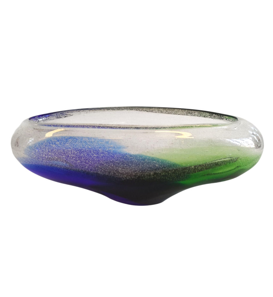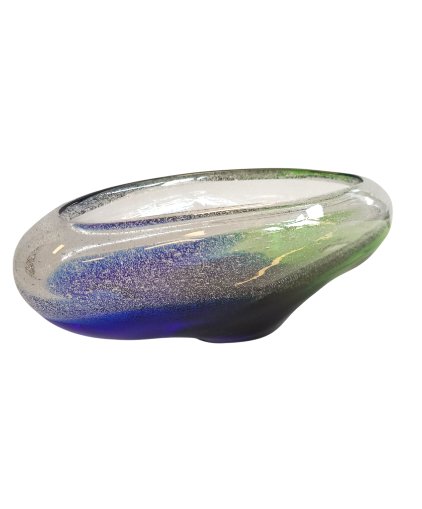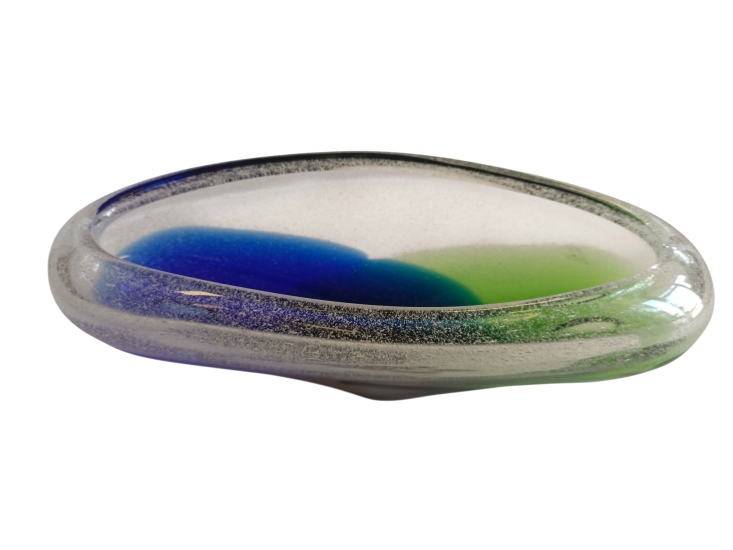 Žardiniéra z hutního skla v modro-zelené kombinaci s vnitřními bublinkami. Autorem je František Špinar, sklárna Škrdlovice. Na výšku měří 9,5 cm, na šířku 26 cm, hloubka je 10 cm. Postava měří 7,5 x 4 cm. Na podstavě škrábanec, jinak ve skvělém stavu. Bez signatury, neznačeno.