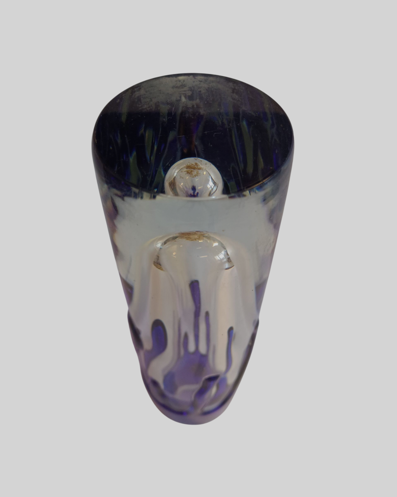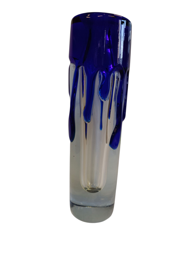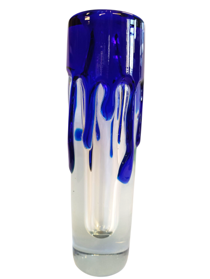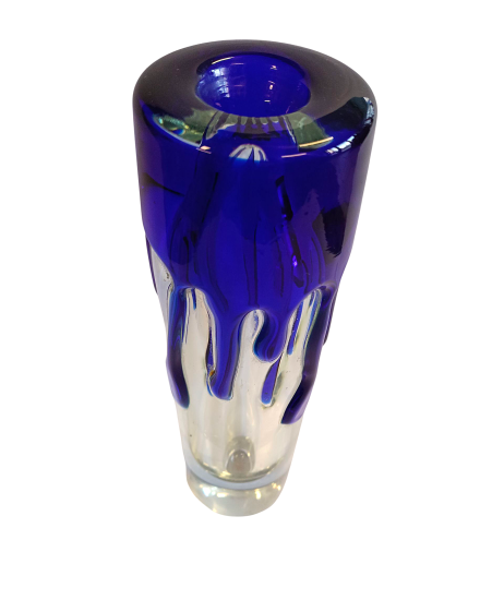 Autorská hutní váza ze škrdlovických skláren od umělce Jaroslava Svobody. Čiré sklo v kombinaci s kobaltově modrou vrstvou, stékající po obvodu jako roztavený vosk.