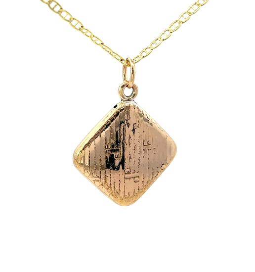 Přívěs obecného kovu. Váha 3,83 g, výška včetně očka 33 mm, v nejširším bodě 24 mm. Kámen je syntetický. Řetízek není součástí nabídky.