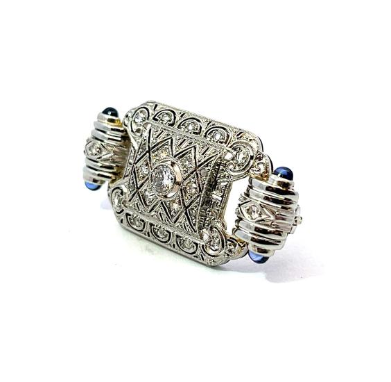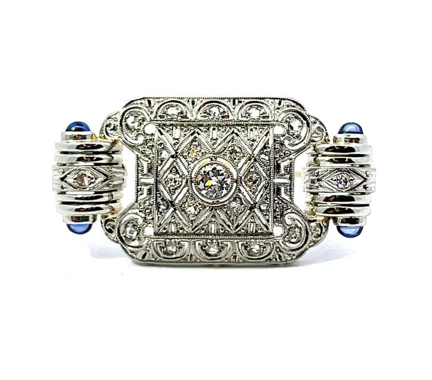 Brož z bílého zlata o ryzosti 585/1000, punc lyra. Váha 8,76 g, délka 34 mm, v nejširším bodě 18 mm. Kámen - přírodní diamant briliantového brusu - 9 ks, centrální kámen: 1 ks, cca 0,10 ct, okolní kameny: 8 ks, cca 0,02 ct každý - dohromady cca 0,26 ct. Kámen - přírodní diamant routa - 14 ks. Kámen - syntetický safír - 4 ks.