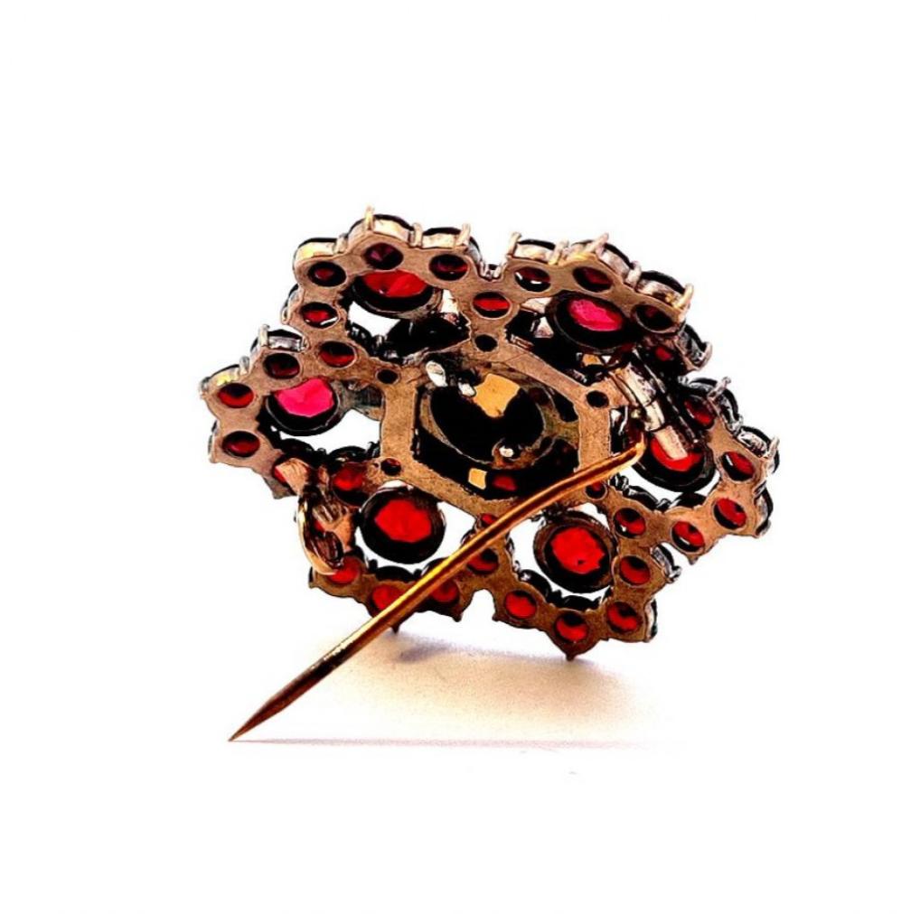 Brož s českými granáty, materiál tombak, váha 9,61 g, průměr 36 mm.