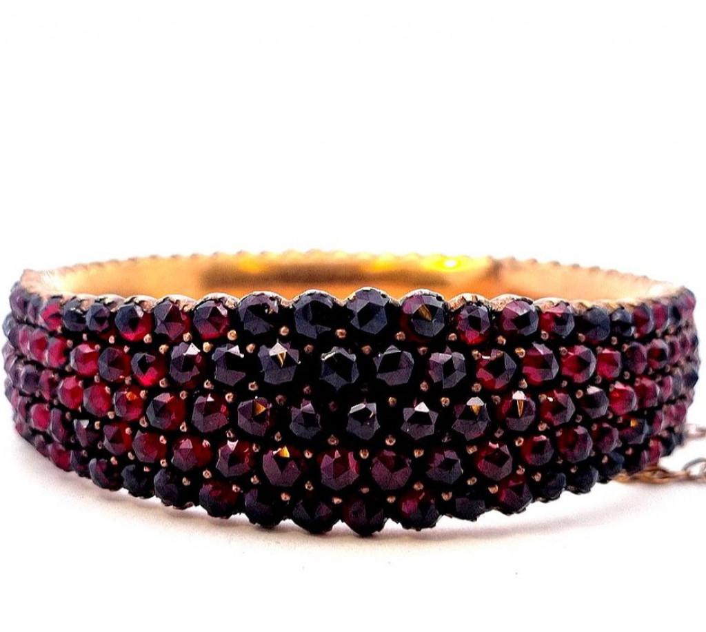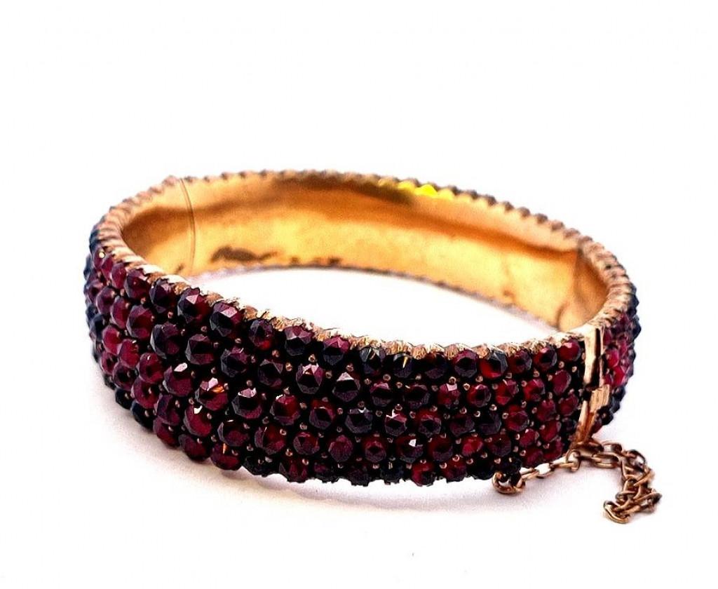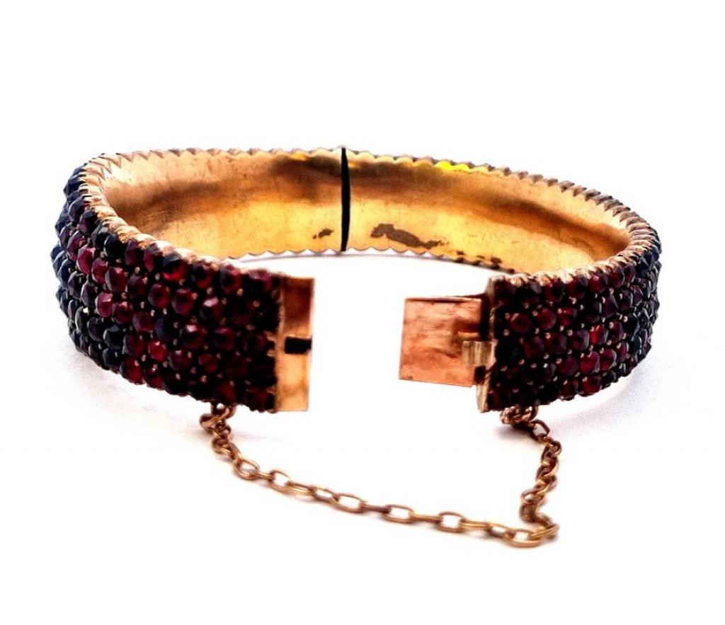 Náramek s českými granáty, materiál tombak, váha 45,80 g, vnitřní průměr 59 mm, v nejširším bodě 20 mm.