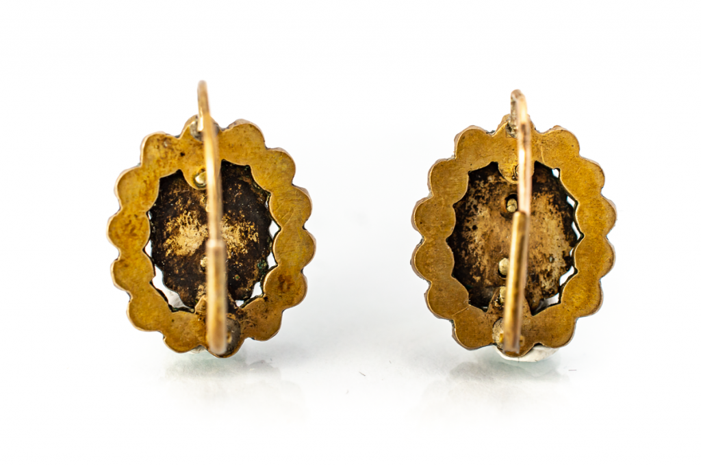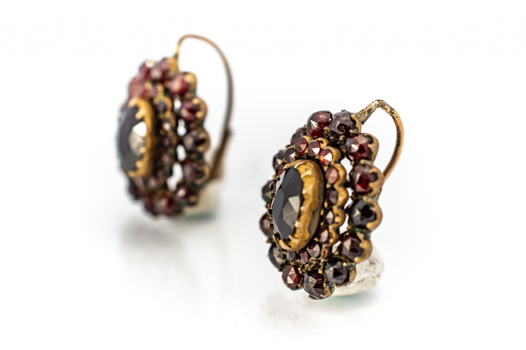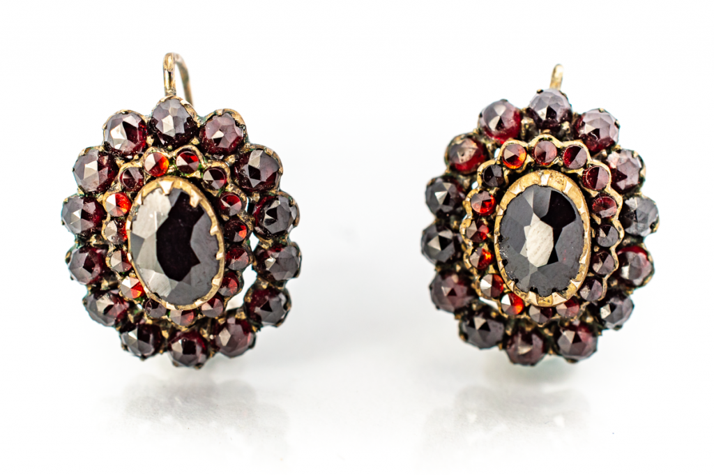 Náušnice s českými granáty, obecný kov, na výšku pohledová část 16 mm, perfektní stav.