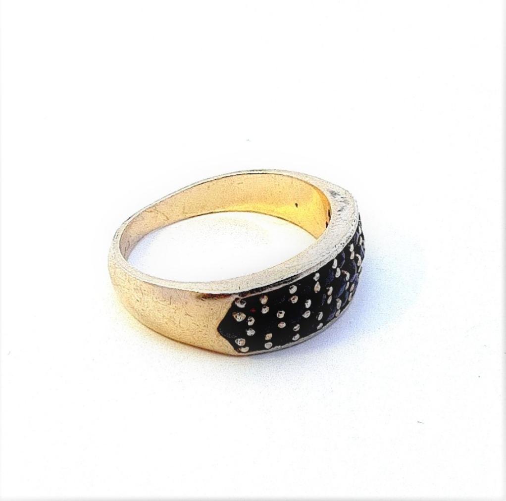 Zlatý prsten o ryzosti 900/1000, punc zajíc, váha 4,19 g, velikost 53, v nejširším bodě 6 mm.