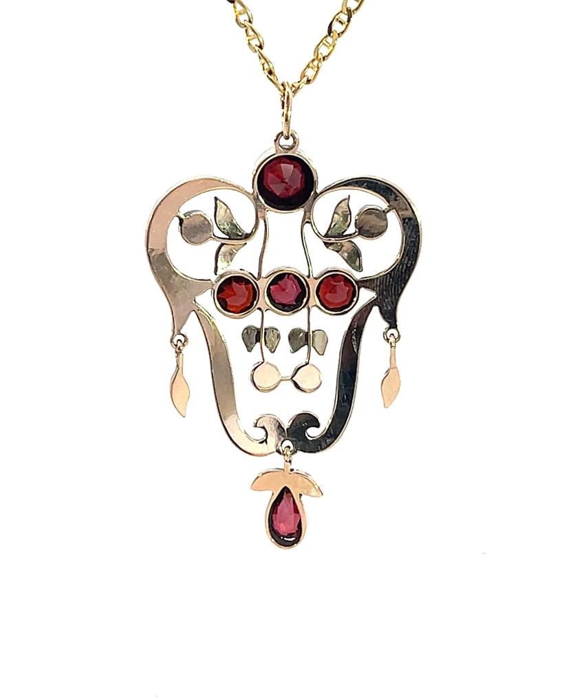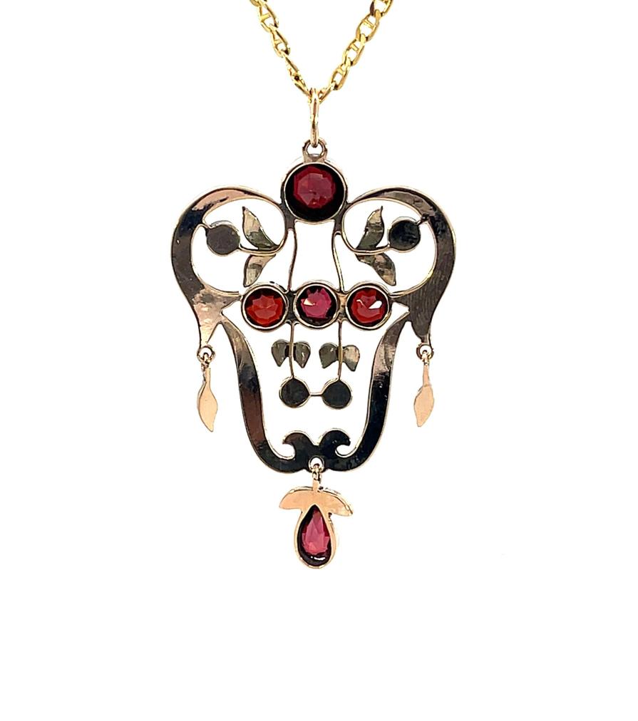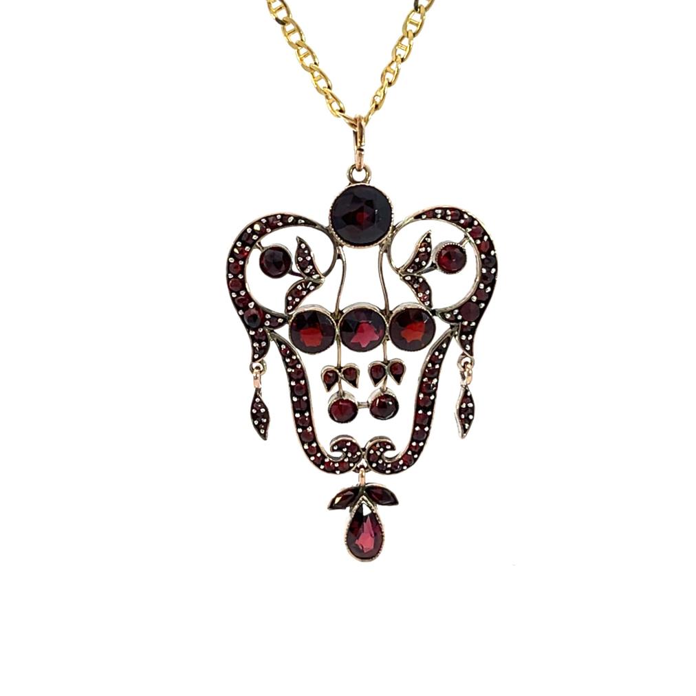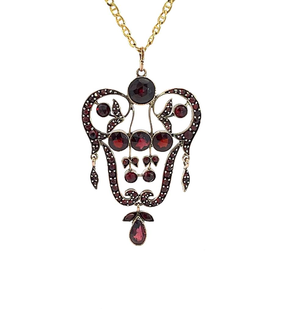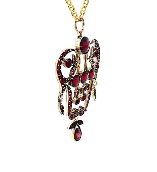 Přívěs v tombaku s almandiny a českými granáty. Váha 5,86 g, výška včetně očka 56,5 mm, v nejširším bodě 33 mm.