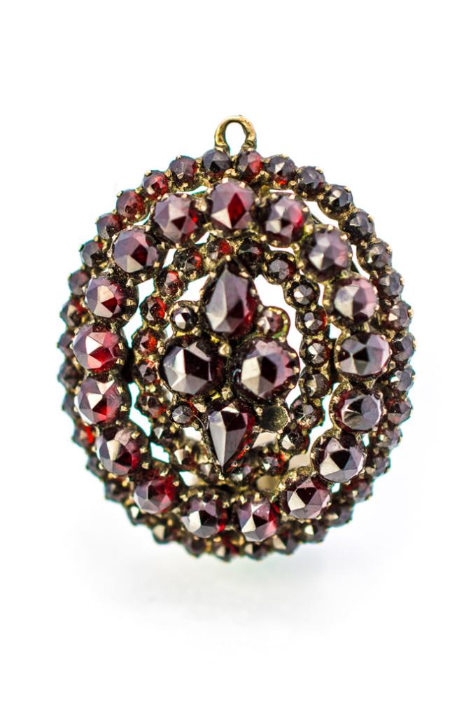 Přívěšek z českých granátů má průměr 28 mm, materiál - obecný kov. Přívěšek lze na zadní straně otevřít a použít jako medailon- skleněná záda.