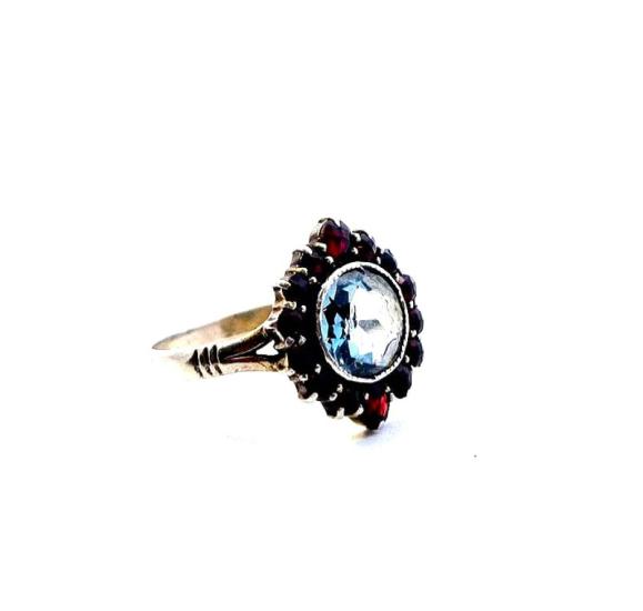 Starožitný stříbrný prsten s českými granáty a modrým kamenem, vel. 58. Ryzost 800/1000, platný punc. Váha 3,03 g, rozměry hlavy prstenu 16 x 8 mm.