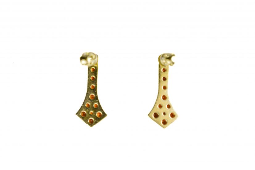 Stříbrné šroubovací náušnice osázené granáty. Ryzost 900/1000, punc zajíc s číslem 3. Váha náušnic 3,83 g. Na délku měří 23 mm, v nejširším bodě 10 mm. Náušnice jsou označeny puncem G (granát).