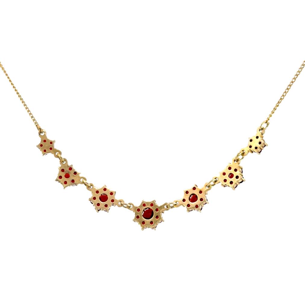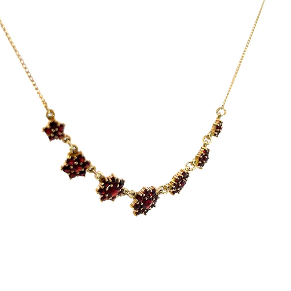 Stříbrný kolier s českými granáty o ryzosti 900/1000, punc zajíc. Délka 44 cm, váha 5,4 g. Průměr největší kytičky 10 mm.