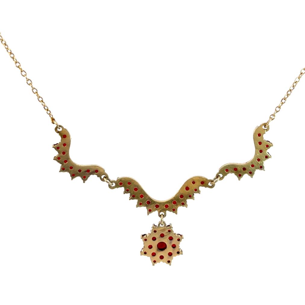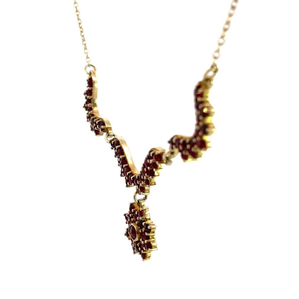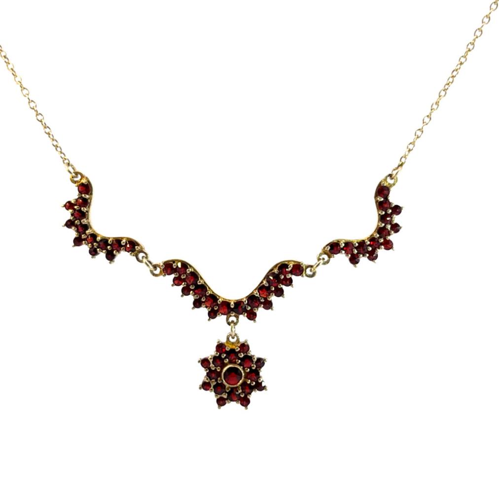 Výjimečný kolier ze stříbra o ryzosti 900/1000 s puncem zajíc, který je zdobený českými granáty. Celková váha je 7,02 g, celková délka je 45 cm. Průměr ozdoby ve tvaru květinky je 13 mm, délka ozdob ve tvaru vlnek je 67 mm. Značeno puncem G, který potvrzuje pravost kamenů.