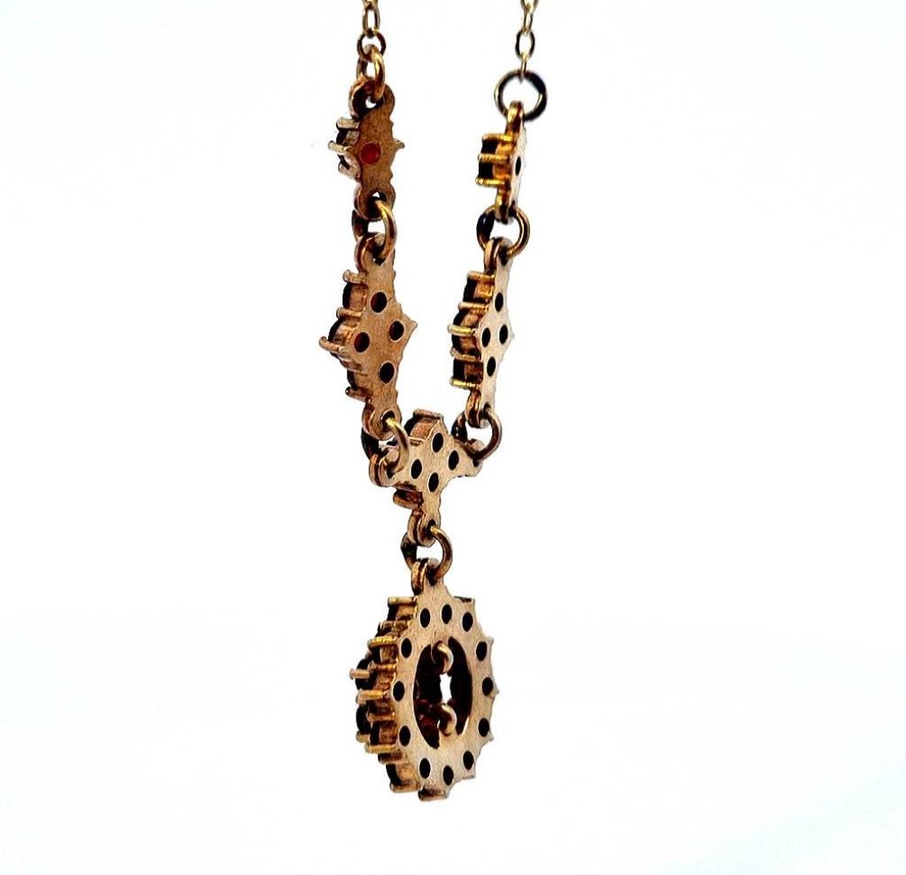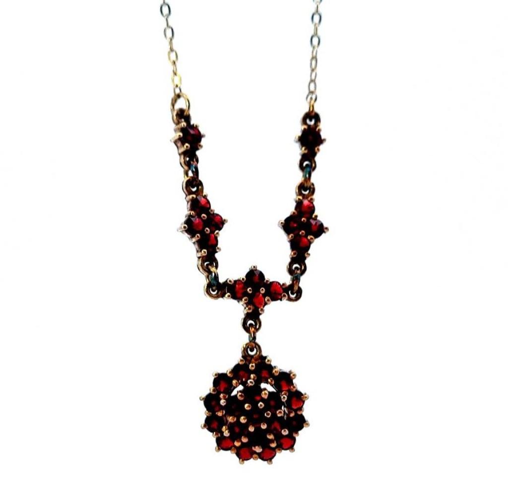 Stříbrný náhrdelník s českými granáty, ryzost 900/1000, punc zajíc. Váha 4,69 g, délka 46 cm, průměr největší ozdoby 12 mm.