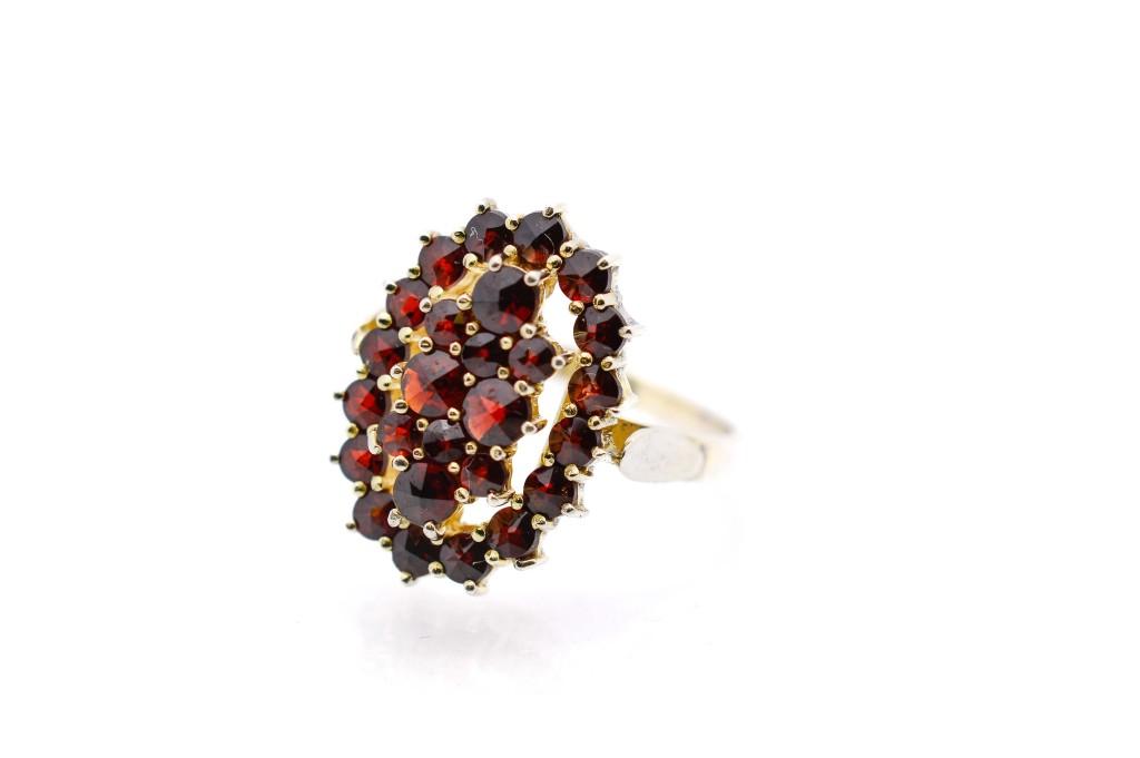 Stříbrný prsten o ryzosti 900/1000, punc zajíc, váha 3,98 g, velikost 56, v nejširším bodě 19 mm. Vrchní část lehce kloktá.