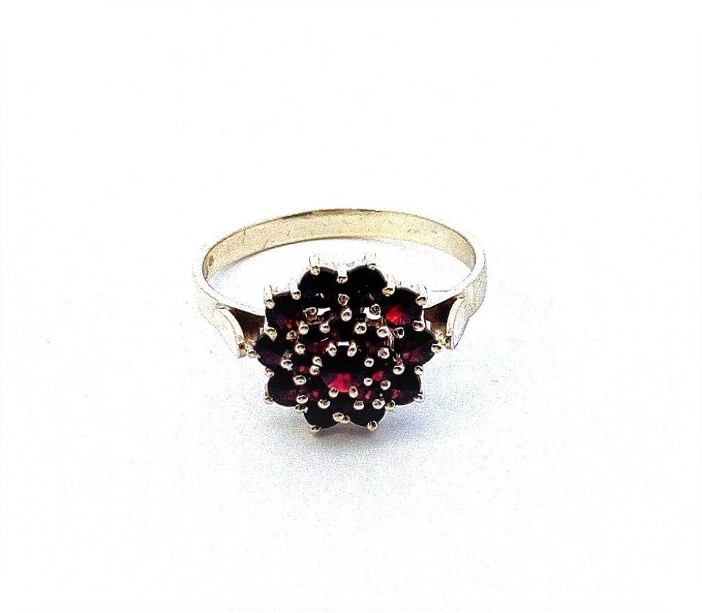 Stříbrný prsten o ryzosti 900/1000, punc zajíc, váha 3,05 g, v nejširším bodě 12 mm.