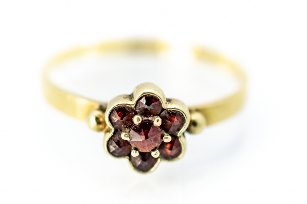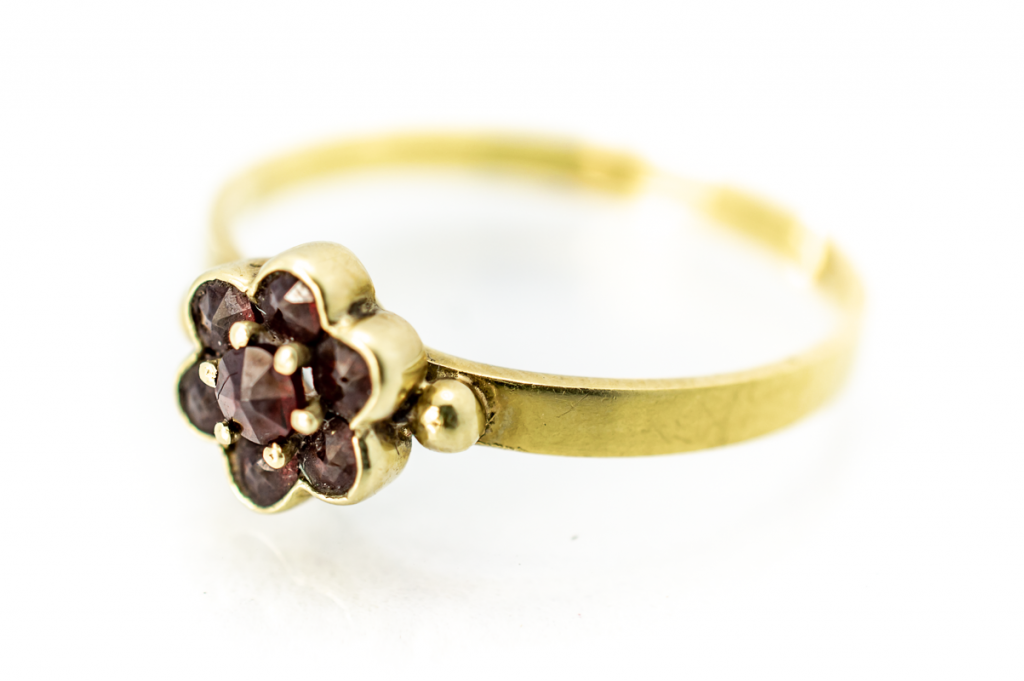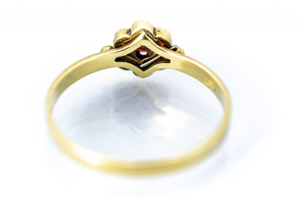 Prsten ze žlutého zlata o ryzosti 585/1000, váha 2,08 g, velikost 57, průměr pohledové části cca 8 mm, punc labuť.