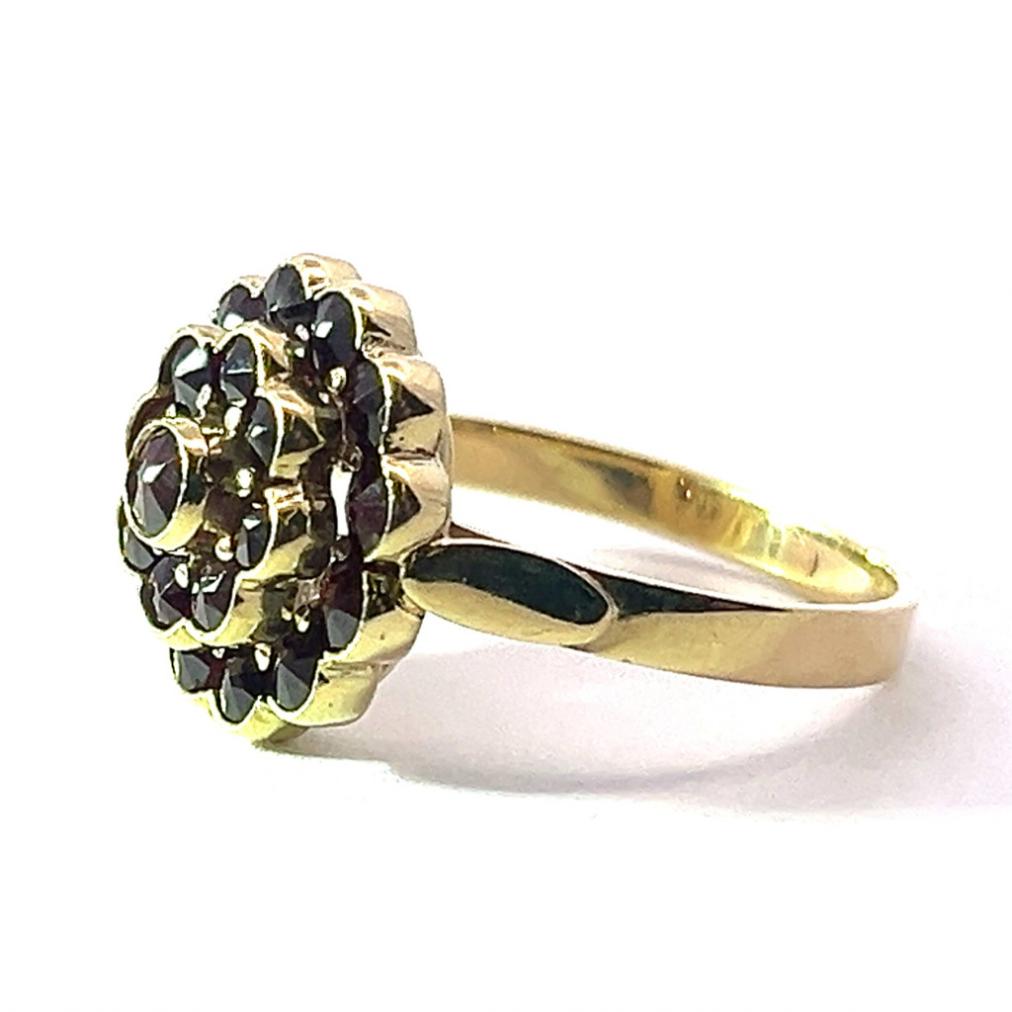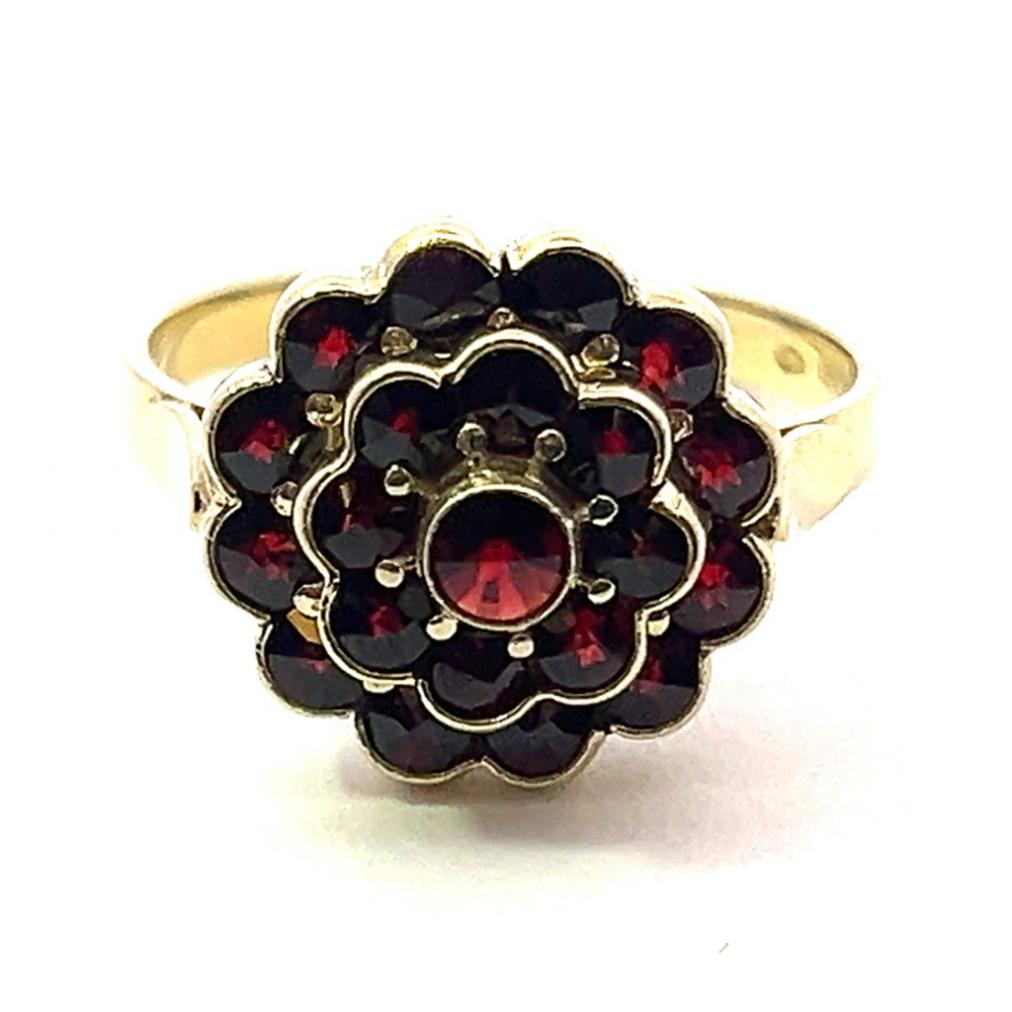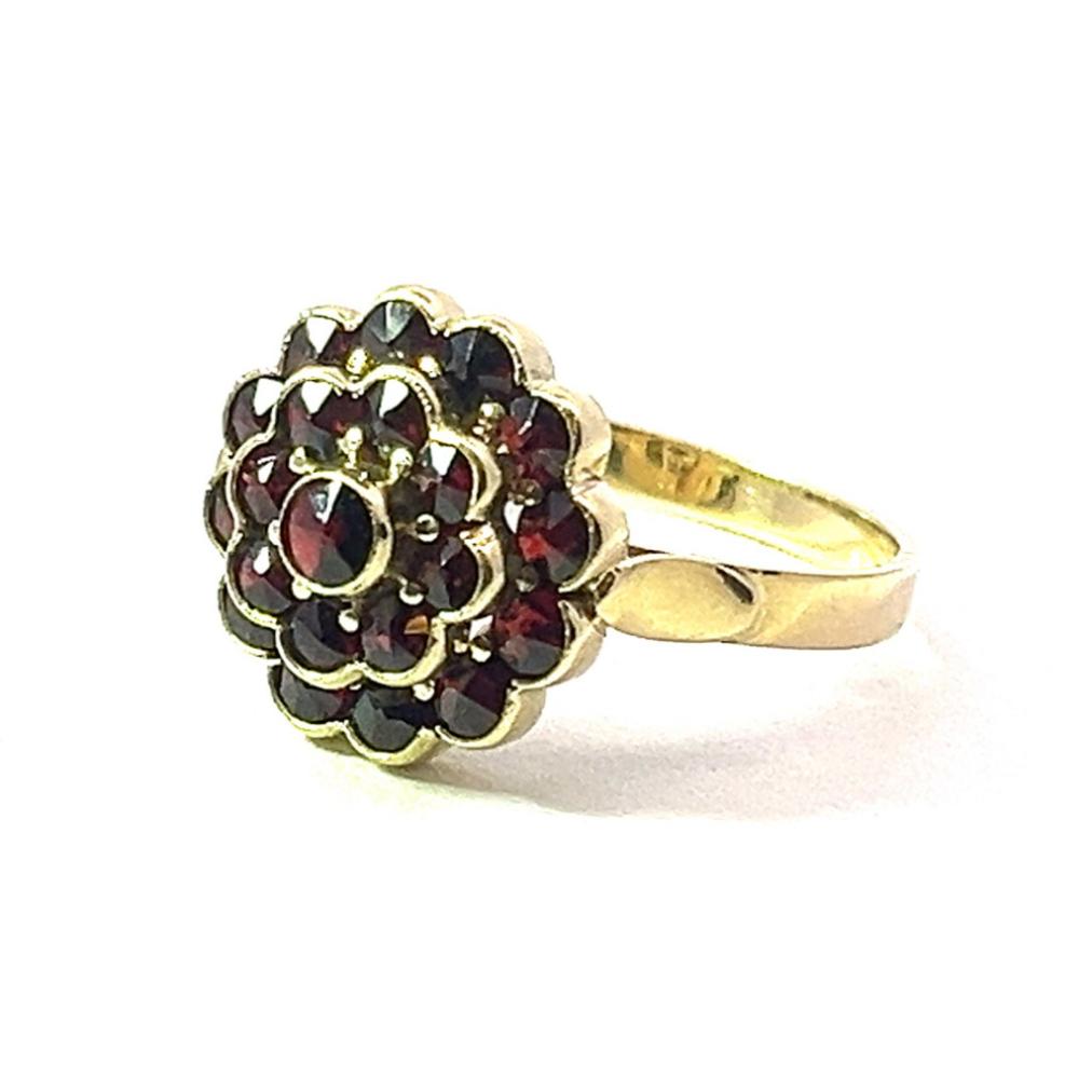 Zlatý prsten o ryzosti 585/1000 s českými granáty s puncem čejka a značkou G. Rozměr prstenu 54, váha 4,23 g. Průměr hlavy prstenu 18 mm. Velikost granátů cca 2,5 mm.