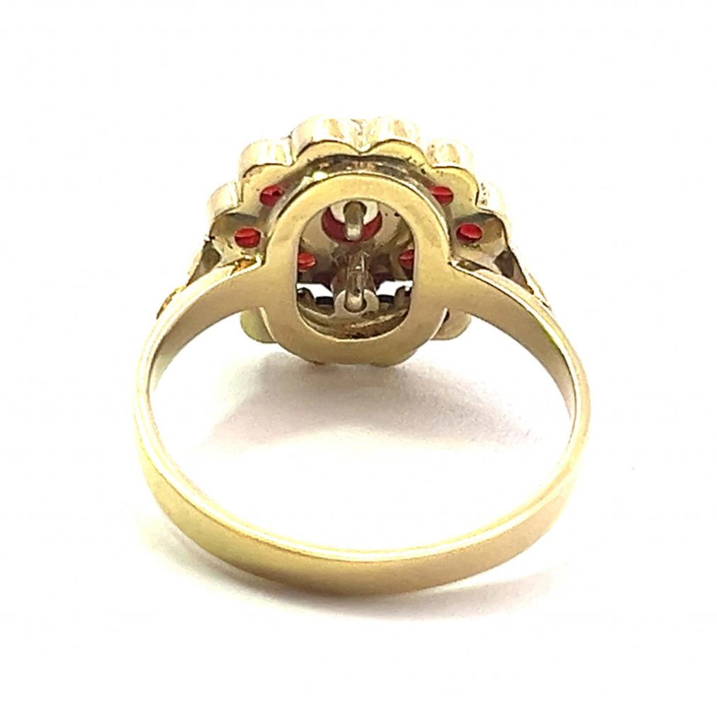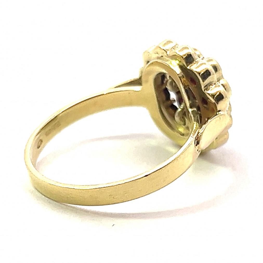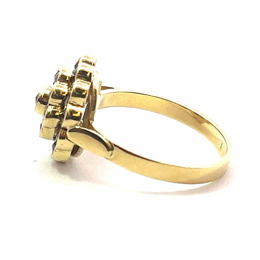 Zlatý prsten o ryzosti 585/1000 s českými granáty s puncem čejka a značkou G. Rozměr prstenu 54, váha 4,23 g. Průměr hlavy prstenu 18 mm. Velikost granátů cca 2,5 mm.