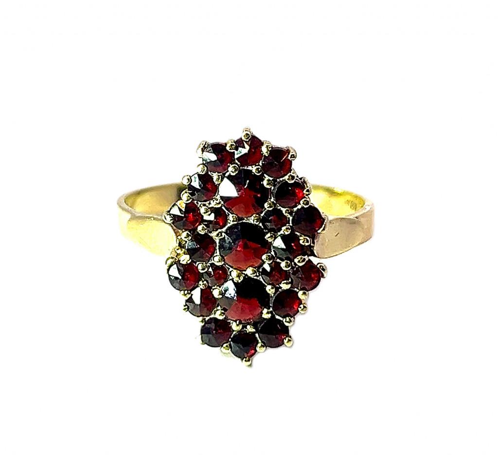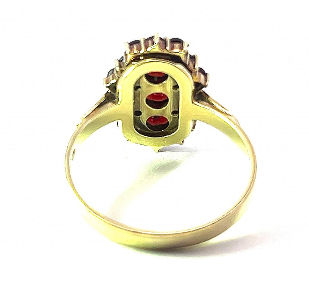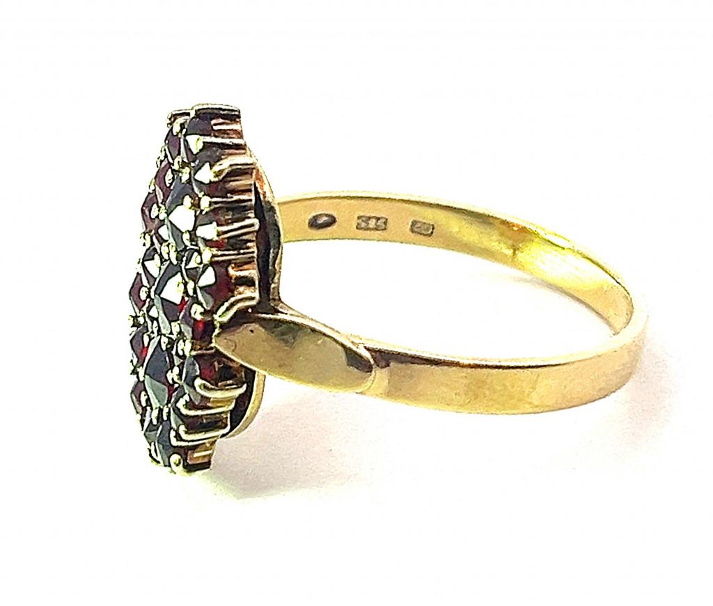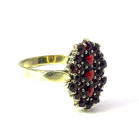 Zlatý prsten o ryzosti 585/1000, punc čejka. Velikost 56, váha 3,78 g, průměr hlavy prstenu 16,5 x 11,5 mm.