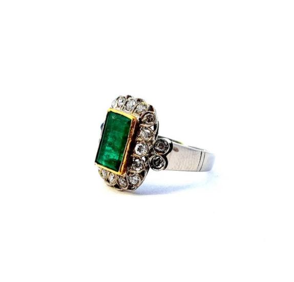 Zlatý prsten o ryzosti 585/1000, váze 5,05 g. Diamanty celkem 0,6ct, s je smaragd přírodní cca 2,3 ct. V nejširším bodě 2,7 cm. Osvědčení o ryzosti z puncovního úřadu a posudek ke kamenům.