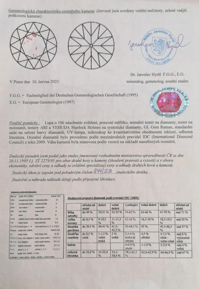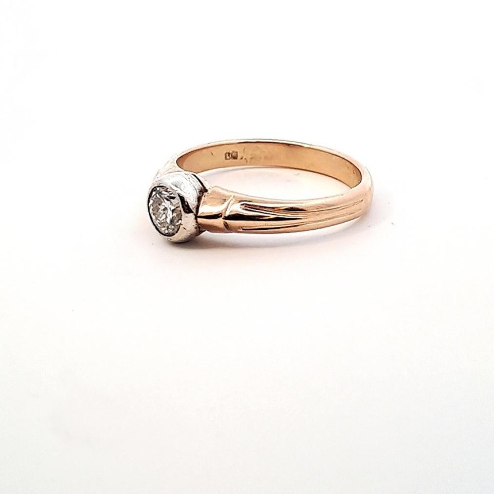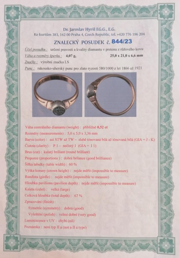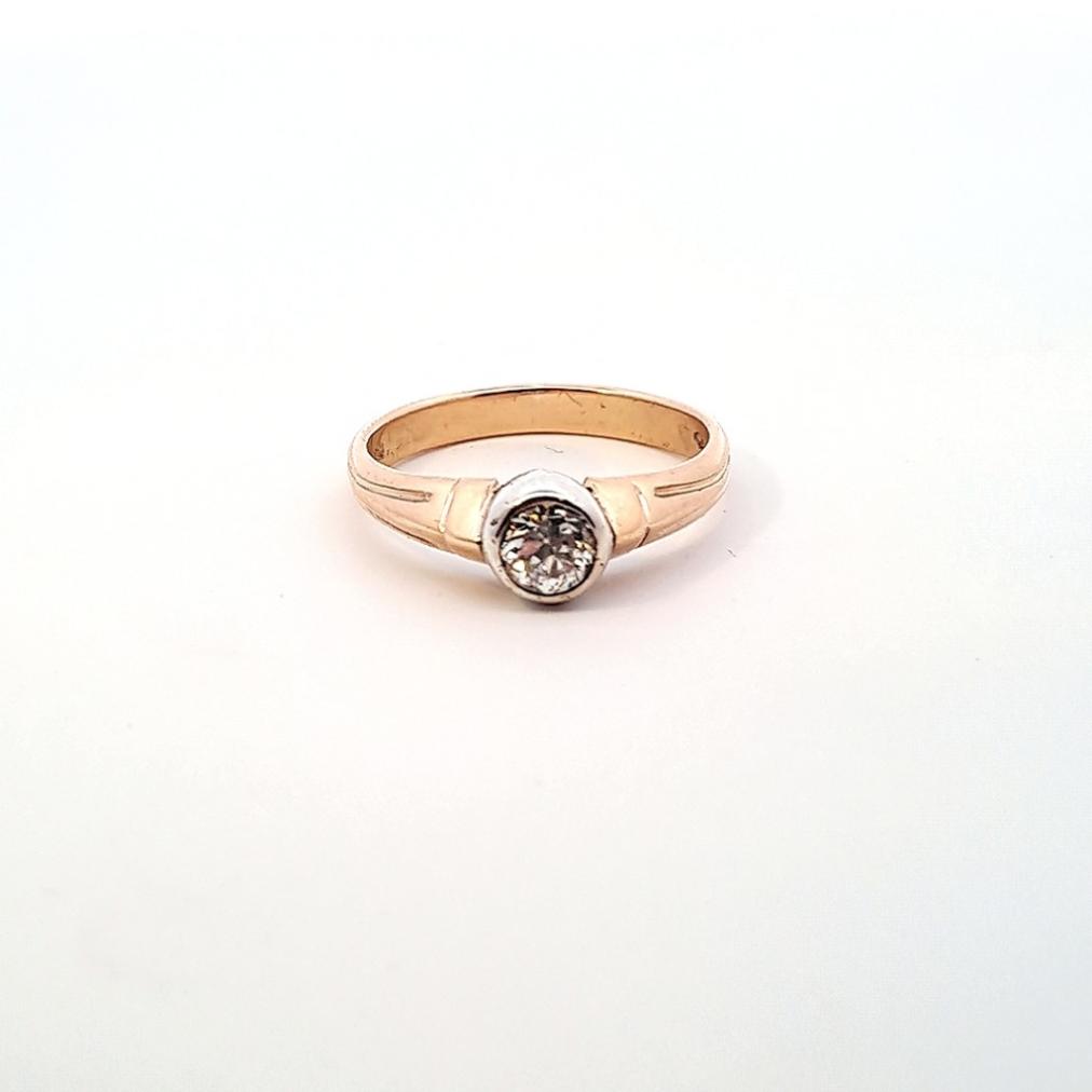 Zlatý prsten o ryzosti 585/1000, punc liška. Velikost 58, váha 4,06 g. Kámen - diamant - 1ks, cca 0,52 ct. Barva: STW až TW, čistota: P1.