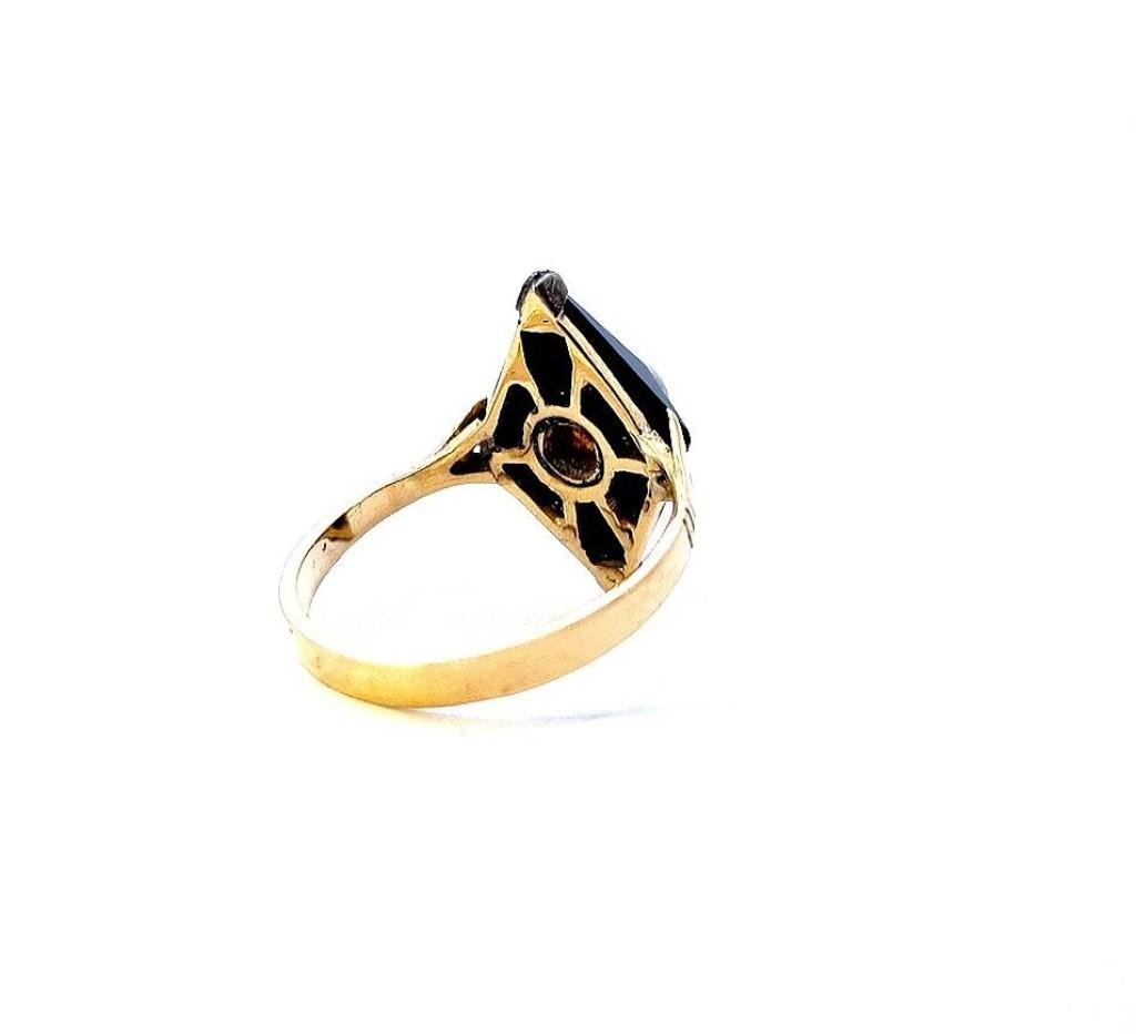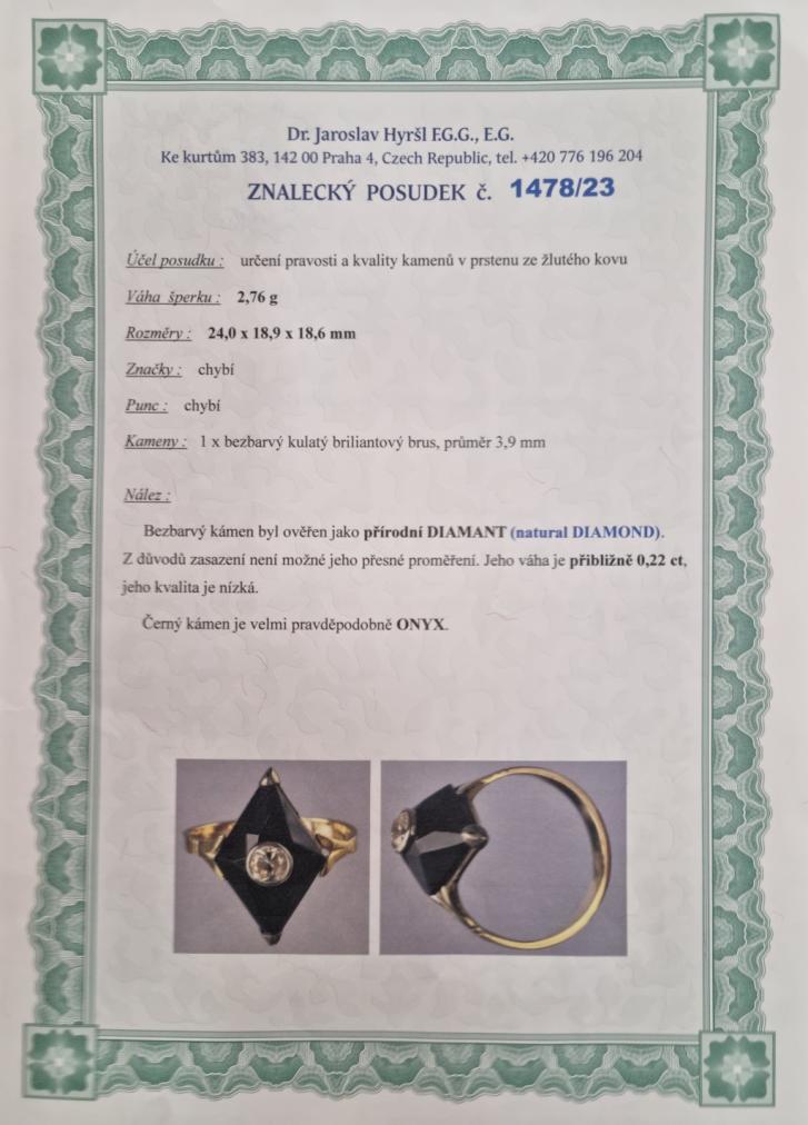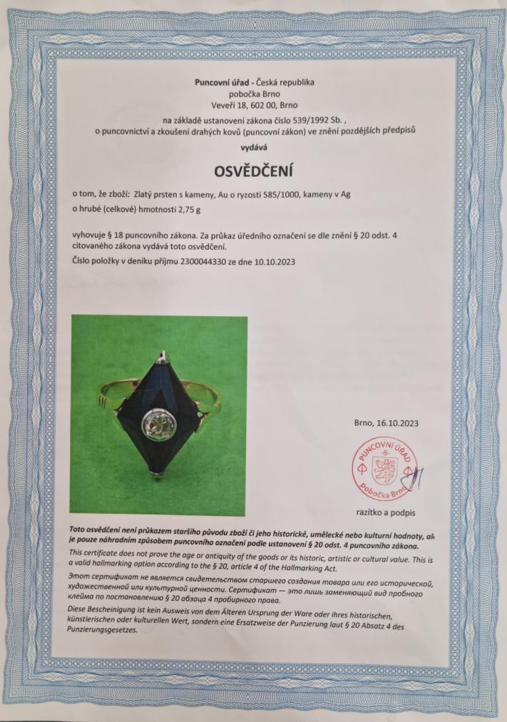 Zlatý prsten o ryzosti 585/1000, váze 2,75 g, kameny ve stříbře. Diamant cca 0,22 ct, černý kámen onyx. V nejširším bodě 2,2 cm.